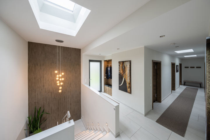 Das Wohnhaus wurde in ein geneigtes Gelände integriert, so dass beide Geschosse ebenerdig zugänglich sind. Im Untergeschoss zur Hangseite befinden sich Bad, Hausanschlussraum, Hauswirtschaftsraum, Werkstatt und Treppe; die Aufenthaltsräume, hier Büroräume und der Hauptzugang, befinden sich auf der hangabgewandten Südseite. Im Obergeschoss wurden alle Wohnräume, Küche, Bad, Abstellraum, Schlafräume und Ankleide untergebracht. Alle Räume sind mit großzügigen Fensteröffnungen bzw. der Wohnraum mit einer Glasfassade versehen. Lichtkuppeln im Dach sorgen auch für Tageslicht im Flur und Treppenhaus. Im Haus befindet sich eine Sauna mit Sommerdusche, eine Doppelgarage sowie ein vorgestelltes Carport. Das Haus wurde in Massivbauweise errichtet und mit einem Wärmedämmverbundsystem versehen. Solarthermieelemente auf dem Dach erwärmen das Brauch- und Heizungswasser. Auf der Südwestseite im Obergeschoss befindet sich eine große Dachterrasse mit Umlauf zum Wohnraum. Die auskragenden Dächer und Terrassen bieten Witterungsschutz auf den Terrassen im Unter- und Obergeschoss.