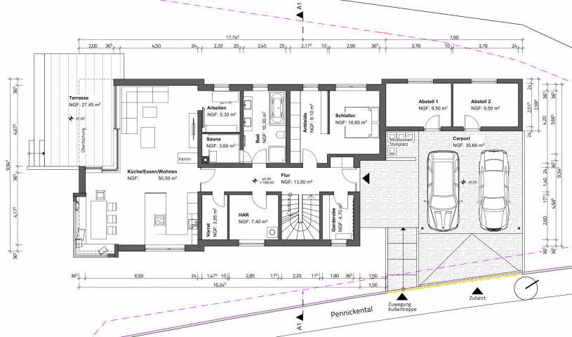 Carport und Nebenräume wurden nördöstlich an den Hauptbaukörper angeschlossen.