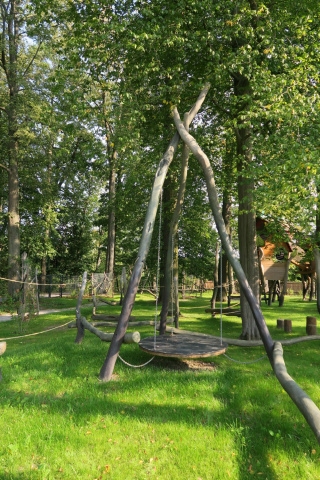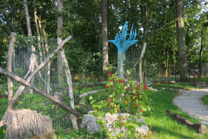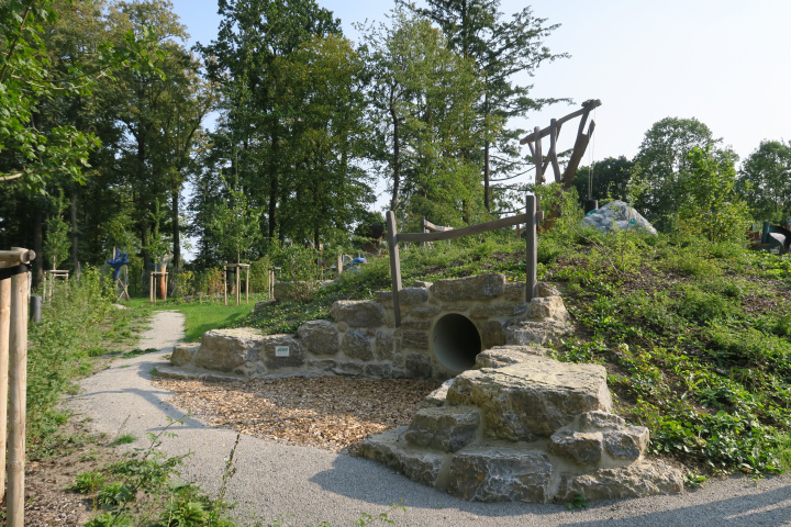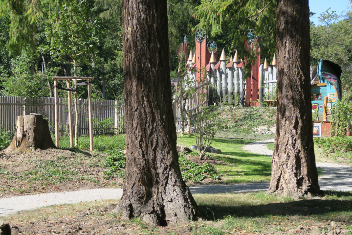 Es wird im Wald und auf Lichtungen gespielt. Eine sanfte Modellierung mit einem unversiegelten Wegenetz, bestehend aus einem breiteren Hauptweg und vielen kleinen Pfaden, gestaltet mit natürlichen Elementen, wie vorhandenen Baumstümpfen, Natursteinen und Stämmen und ergänzt durch unzählige Anpflanzungen, angefangen von Rasenansaat, über Bodendecker, Stauden, Sträucher bis hin zu über 30 Baum-Ergänzungspflanzungen.