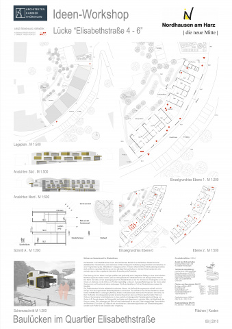 Die Baulücke in der Elisabethstrasse ist ein herausforderndes Baufeld in der Nordhäuser Altstadt mit hoher städtebaulicher Verantwortung. Das historische Umfeld verlangt eine Schließung des gestreckten Grundstückes um einer Fragmentierung des „Altstadtkerns“ entgegenzuwirken. Trotz der offensichtlichen Defizite (allseitig einsehbar, stark profiliert, ungünstige Belichtung und eine ständige Geräuschkulisse in nächster Nähe) besitzen die sehr zentrale Lage und das umgebende historische Ensemble große Potentiale.