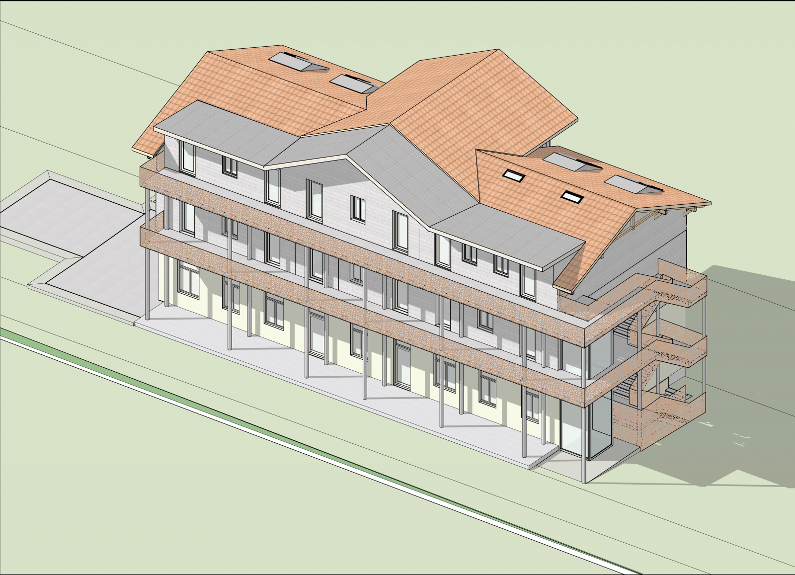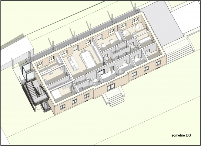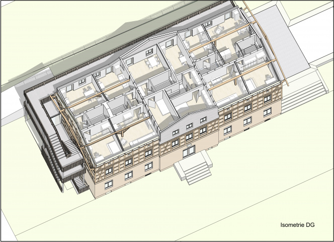 Im 1.Obergeschoss und Dachgeschoss wurden insgesamt 4 Stk. 2-Raumwohnungen für je einen Bewohner und 4 Stk. 3-Raumwohnungen für je 2 Bewohner hergestellt. Im DG wird 1 Zimmer mit Bad als Betreuereinheit für die nächtliche Bereitschaft vorgesehen. Die Wohnungen verfügen über eine Küche bzw. Wohnküche nach Süden und ein separates Zimmer nach Norden.