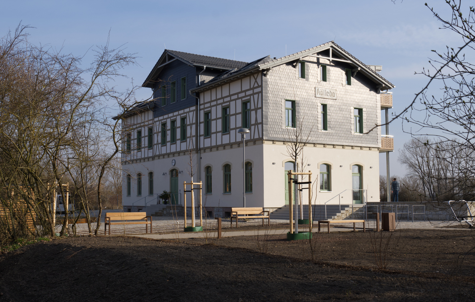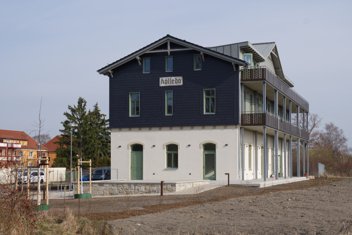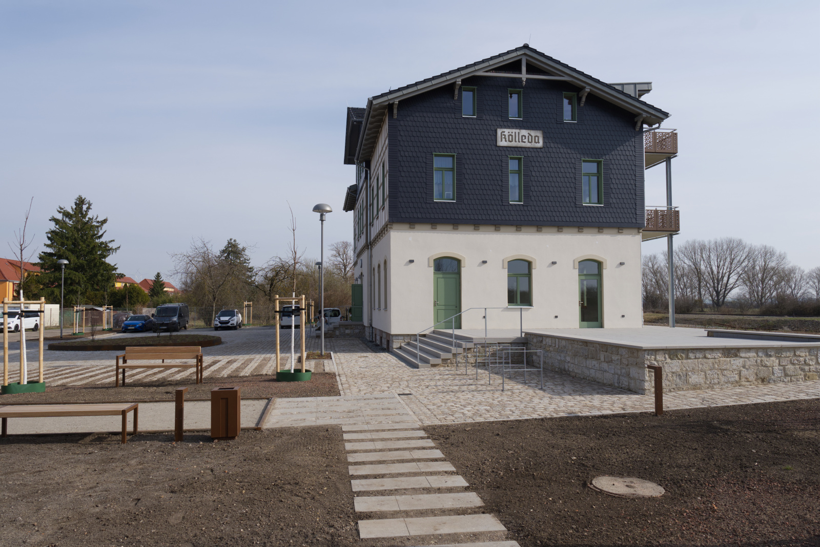 Das alte Bahnhofsgebäude liegt repräsentativ am Ende der Bahnhofstraße. Der Bahnhof aus dem Jahr 1874 ist mit dem Bau eines neuen Haltepunktes seit 2014 nicht mehr im Betrieb. Nahzu 10 Jahre konnte das Gebäude aufgrund von ausstehenden Sanierungsmaßnahmen nicht genutzt werden. Im Jahr 2022 wurde das Gebäude durch die WWG Kölleda GmbH, dem kommunalen Wohnungsunternehmen der Stadt Kölleda, erworben und bis Ende 2025 umgebaut und saniert. Das Gebäude wird fast vollständig durch den Betreiber, der Stiftung Finneck, für die Betreuung junger Menschen mit autistischer Erkrankung genutzt. Hierzu wurde das zentrale Bestandsgebäude erhalten. Der westliche eingeschossige Anbau der Gepäckabfertigung wurde abgebrochen. Das Gebäude wurde in Bezug auf die Erschießung der Obergeschosse neu organisiert. Aus Platzgründen erfolgt die Erschließung über einen 2-geschossigen Laubengang auf der Südseite. Das Erdgeschoss wird weiterhin hauptsächlich über den zentralen Haupteingang im Norden erschlossen. Im EG sind die Tagesstruktur, eine Betreuerwohnung und ein Cafébereich mit entsprechenden Sanitärbereichen untergebracht. Die Tagesstruktur dient der Betreuung der Jugendlichen, sie besteht aus einem großen zentralen Gemeinschaftsraum mit Küchenbereich und 2 kleineren Räumen zum Aufenthalt / Rückzug bzw. einem Werk- / Atelierraum. Auf der Ostseite befindet sich ein Cafébereich der durch die Bewohner/Betreuer betrieben werden kann oder durch einen separaten Nutzer. Im Westen, dem Cafebereich vorgelagert, befindet sich eine kleine Sitz- und Freifläche auf dem Sockel des ehemaligen Anbaus. Im nördlichen Gebäudeteil befinden sich die Sanitärbereiche. Aufgrund der topografischen Besonderheiten erfolgt die Zugänglichkeit des Objektes für Rollstuhlfahrer von der Südseite.