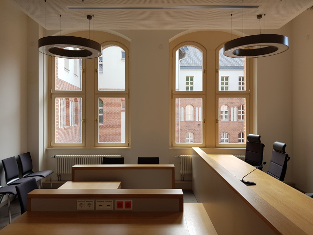 Bei dem Rudolstädter Amtsgerichtsgebäude handelt es sich um ein historisches Gebäudeensemble in Innenstadtlage, bestehend aus drei Bauteilen unterschiedlicher Enstehungszeit. Die heute erhöhten Sicherheitsanforderungen an ein Gericht konnten durch Sanierung und Umbau des Verwaltungsbaus baulich in die alltäglichen funktionellen Abläufe integriert werden. Durch klare Eingriffe wurde der einstige Zellentrakt in hochwertigen Archivraum umgewidmet. Im Bereich des ehemaligen Zwischenbaus wurde ein neuer Baukörper eingefügt, der die vorhandene Formensprache und Materialität neu interpretiert. Der restauratorische Schwerpunkt der Baumaßnahme lag auf den repräsentativen Eingangsbereichen, Sälen und Verkehrsflächen des Hauptgebäudes, die um neue Elemente funktional ergänzt wurden. Büro- und Archivräume erhielten dagegen eine zurückhaltendere, zeitgemäße Gestalt. Das gesamte Gebäude wurde mit schlichtem und bedarfsgerechtem Mobiliar neu ausgestattet.