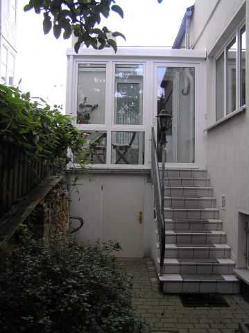 Eine vorher wenig genutzte kleine Terrasse erhält durch die Einhausung mit einer Glaskonstruktion eine neue Aufenthaltsqualität.