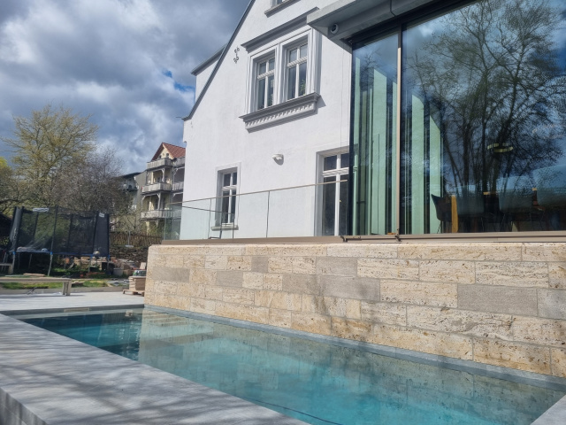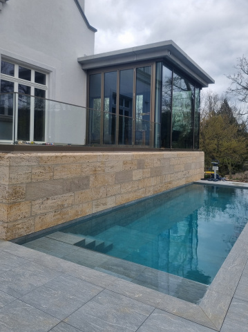 Das Projekt umfasst neben der Wohnraumerweiterung die Vergrößerung der Terrasse, einen Außenpool, und die Erneuerung der Heizung als Gas-Hybrid-Heizung mit Sonnenkollektoren. In der Unterkellerung der neuen Terrasse ist die Technik des angrenzenden Pools untergebracht. Die Unterkellerung des Wohnraums nimmt einen Hauswirtschaftsraum und - über einen Gartenzugang erreichbar - die Sanitärraume und Umkleide für den Pool auf.