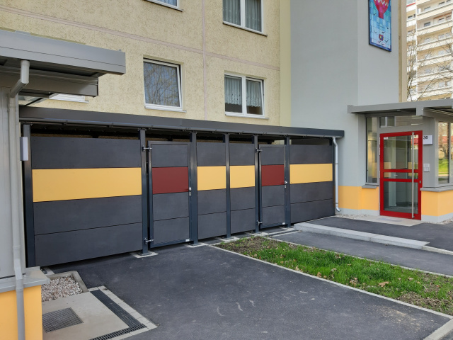 Wohngebäude in typischer Plattenbauweise WBS-70 wurde im bewohnten Zustand mit Außenaufzügen versehen. Die Aufzüge halten auf jeder Etage incl. Kellergeschoss.