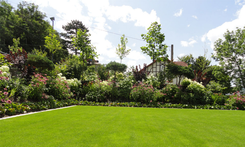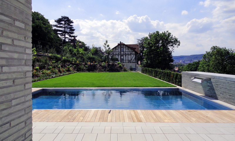 Für die neue Villa in Südwesthanglage mit hervorragendem Blick ins Tal wurde für den Poolgarten eine große Rasenfläche mit attraktiver Rahmenplanzung aus Blütengehölzen und Stauden in der Farbkombination weiß/violett/orange/grün enworfen.