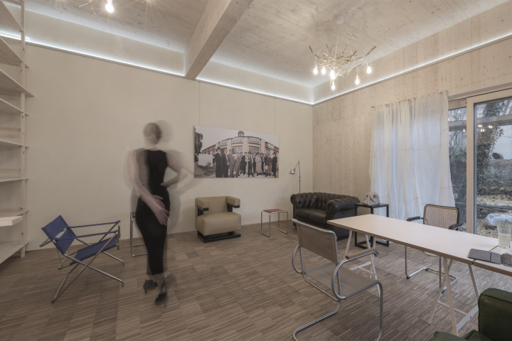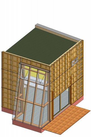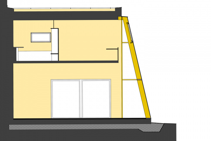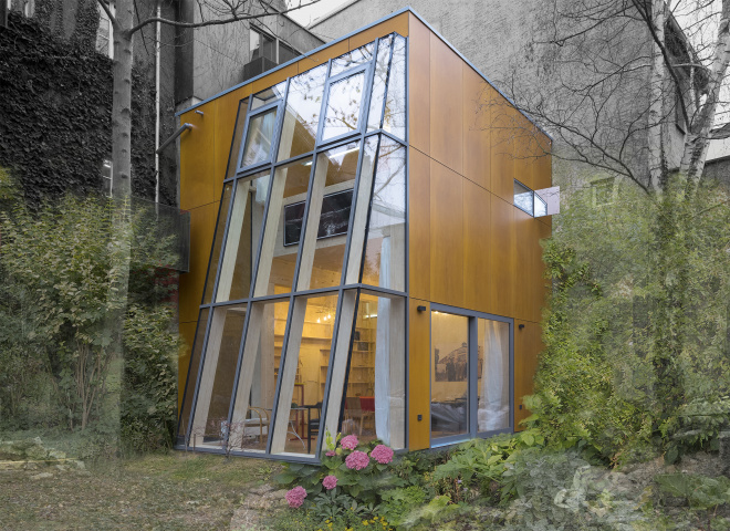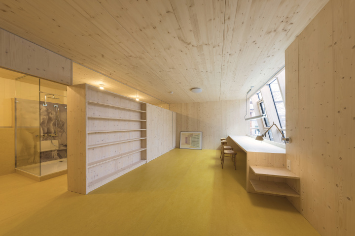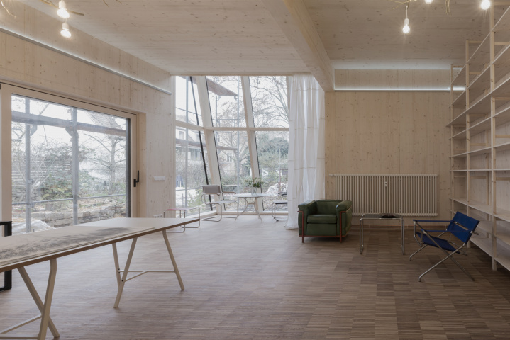 Der Anbau eines Ateliergebäudes wurde bewusst mit Holzbauteilen ausgeführt, da die schwierige Beschaffenheit des Grundstücks hinter einer historischen Zeilenbebauung keine übliche Baustelleneinrichtung zuließ. Die vorgefertigten Bauteile wurden sämtlich mit einem Schwerlastkran über den Altbaubestand gehoben und montiert.