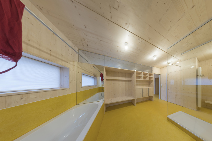 Zusätzlich zur Außenwandkonstruktion aus „Vollholz“ wurde die Holzfaserdämmung mit Parklexelementen verkleidet. Diese Fassadenplatten betonen die natürliche Schönheit der Gebäudehülle, welche sich angenehm in den angrenzenden Hausgarten einfügt.