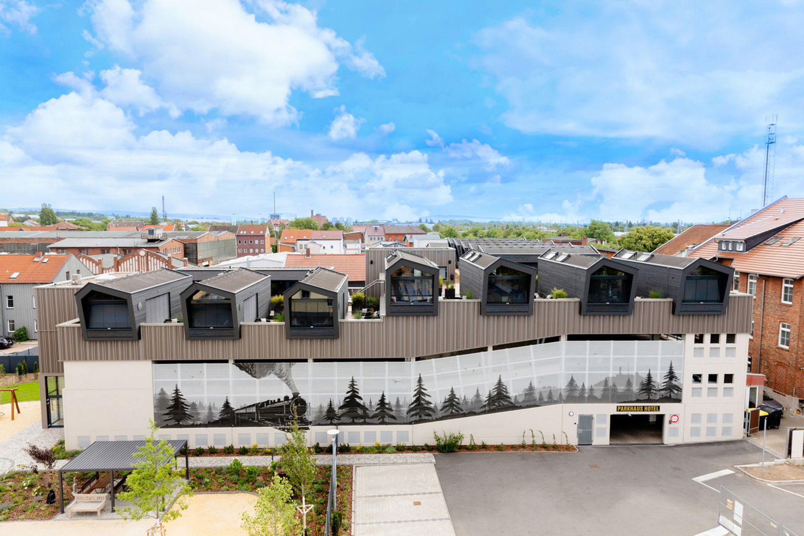 Gegenstand und Objekt der Baumaßnahme war ein den 1990er Jahren errichtetes Parkhaus in der Innenstand von Nordhausen. Im Zuge der Neukonzeption des Hotels "Nordhäuser Fürstenhof" erfolgte die Aufstellung von 12 Ferienhäusern in Form von vorgefertigten Tiny-Häusern in Holzbauweise auf dem vorhandenen oberen Parkdeck des Parkhauses. Auf dieser Etage entstand mit den Ferienhäusern ein Wellness- und Erholungsbereich mit Sauna und Terrassen für die Gäste des Hotels. Mit der Errichtung der Ferienhäuser erfolgte auch die gestalterische Überarbeitung der vorhandenen Parkhaus-Fassaden - insbesondere die westliche Lochblech-Fassade des Parkhauses wurde verschönert durch großes Wandbild mit Motiven vom nahen Harz.