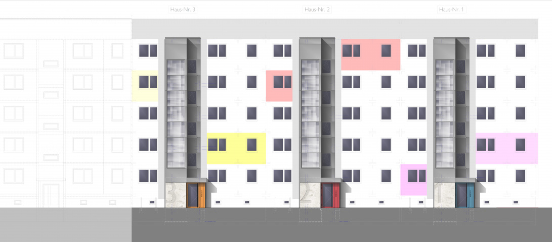 Die neuen außen vorstehenden Aufzugsschächte wurden im EG massiv in Sichtbeton hergestellt um im Bereich der höchsten mechanischen Beanspruchung möglichst robust zu sein. Oberhalb des EG wird der Aufzug durch eine glatte Alucobond-Fassade verschlossen mit einer Sonnenschutzverglasung Richtung Osten um während der Aufzugsfahrt entsprechend eine Blick ins Quartier zu erhalten.