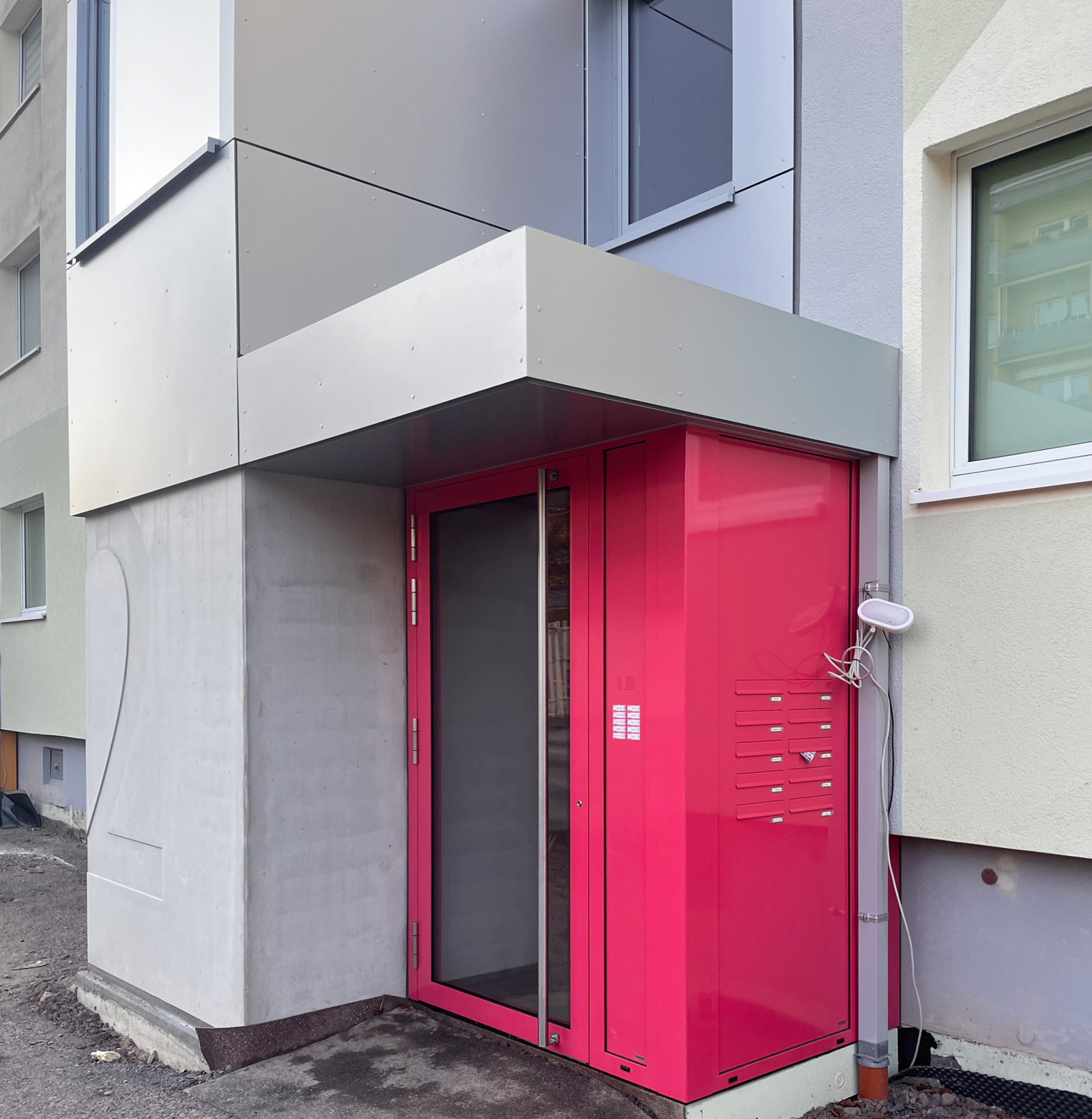 Der Hauseingangsbereich erhält einen überdachten Vortritt mit entsprechender An- und Untersicht. Die zurückliegende verglaste Hauseingangstür als Alu-Konstruktion beherbergt die Funktionen der Klingel- und Briefkastendurchwurfanlage des Hauseingangs und bilden den Farbpunkt der farblich eher zurückhaltenden Gesamtanlage. Jeder Eingang wird durch einen dreiseitigen LED-Stripe zurückhaltenden ausgeleuchtet.