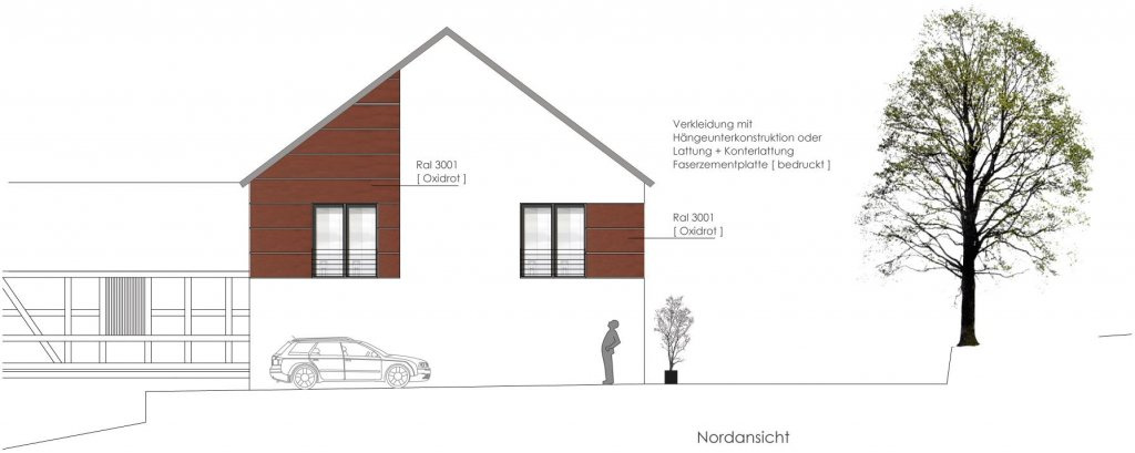 Die Außenhaut ist aus weißem Glattputz und mit oxiroten Faserzementplatten erstellt, wobei die Holzmaserung eine Bezug zur alten Struktur zieht.