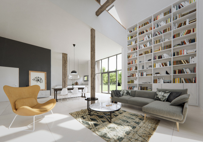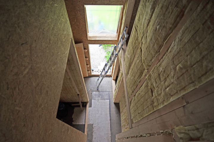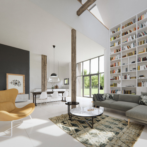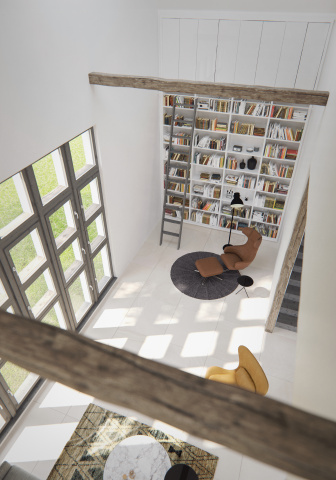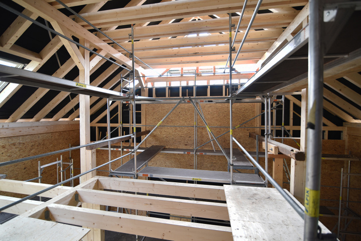Der Ent- wurf sieht eine Nutzung auf zwei Ebenen vor. Im Erdgeschoss werden die halböffentlichen Nutzungen, wie z.B. Küche, Gästezimmer, Gästebad und Wohnzimmer angesiedelt. Der Wohnbereich erstreckt sich in der gesamten Gebäudehöhe bis unter den First. Hier kann das komplette Gebäudevolumen des Baukörpers wahrgenommen werden. In dem als Galeriegeschoss ausgebildeten Obergeschoss finden sich die privaten Nutzungen, wie z.B. Bad, Ankleide und Schlafzimmer wieder. Um den Charakter als Feldscheune zu erhalten, wird eine Holzfaser-Innendämmung mit Lehmputz verwendet. Die Gefache werden neu ausgemauert und geputzt. Somit bleibt die Aussenfassade als Fachwerkkonstruktion sichtbar. Die ehemaligen großen Toröffnungen bleiben durch Einbau einer Pfosten- Riegel-Konstruktion aus Holz und Glas op-tisch erhalten.
