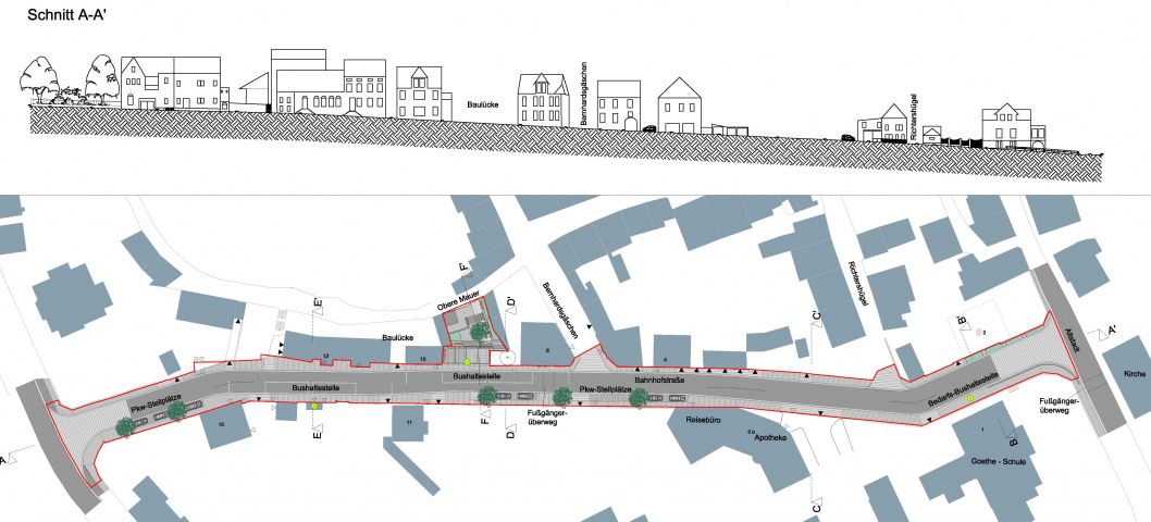 Für die Verbesserung der Busanbindungen zur Innenstadt Königsee wurde ein Abrisshaus in der Bahnhofstraße erworben. Diese Baulücke war zu einer Bushaltestelle und einem Übergangsbereich in die Innenstadt umzugestalten. Die gesamte Bahnhofstraße wurde grundhaft erneuert, die Nebenflächen neu gestaltet und die Bushaltebereiche zur neuen Freiflächen verlegt. Die Fassadenfluchten wurden durch eine Große Pergola mit integrierter Bushaltestelle (Überdachung/ Glasfront) wieder aufgenommen um die geschlossenen Straßenkanten zu erhalten. Die Freifläche in der Baulücke wurde in 3 Bereiche höhengestaffelt gegliedert.