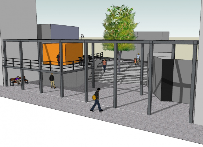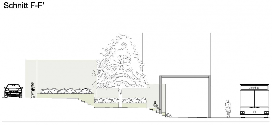 Die obere Ebene wurde mit direktem Bezug zur Altstadt für eine spätere Kioskbewirtschaftung ausgelegt. Längerfristig ist die Ansiedlung eines dauerhaften Verkaufsstandes mit Imbiss, Fahrkarten und Zeitungen geplant die als feste, moderne Raumzelle auf den vorhandenen Pflasterbelag aufgesetzt wird. Um die nötigen Flächengrößen für Außenbewirtschaftung im Sommer zu erhalten wir die Fläche balkonartig bis in die mittlere Ebene geschoben. Begrünt wird ein Streifen vor der Nordseite.