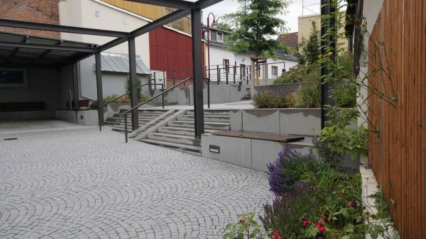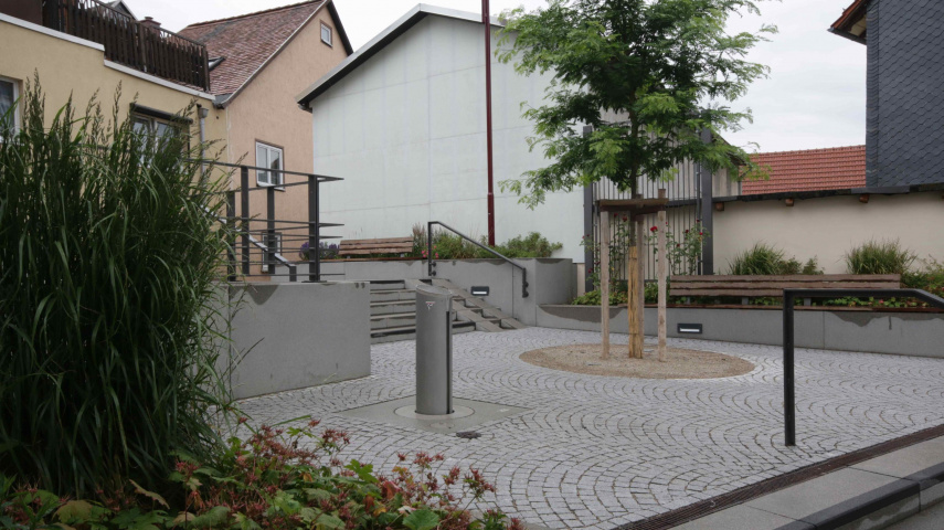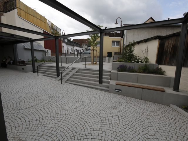 Die mittlere Ebene ist durch Höhensprünge von beiden Straßen getrennt und somit als bevorzugte Aufenthalts - und Verweilfläche gut abgeschirmt. Neben einem großen Solitärbaum und einem Trinkbrunnen wird die Fläche durch Sitzmauern gerahmt, die sich über Sitzstufen zur unteren Ebene fortsetzen.