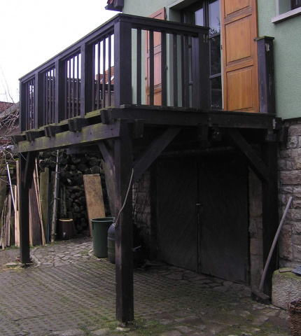 Ein desolater Balkon aus Holz wurde durch eine filigrane Stahlkonstruktion mit Beplankung aus Hartholz ersetzt.