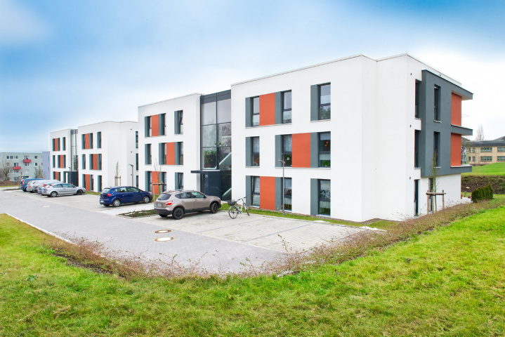 Mit der Gestaltung eines zentralen Grünzuges, der “Grünen Achse”, wurde in Leinefelde eine Verbindung vom Bahnhof über die Neubaugebiete der Südstadt geschaffen. Dabei wurden bestehende Strukturen aufgenommen und im Zentrum mit intensiven in den Randbereichen mit extensiven Gestaltungselementen ergänzt und Bereiche hoher Aufenthaltsqualität geschaffen. In dieser exponierten Lage entstand ein neuer Wohnkomplex, der aufgrund seiner architektonischen Anreize wie Barrierefreiheit, optimalem Zuschnitt der Wohnungsgrößen, hervorragender Verkehrsanbindung und sehr guter Erreichbarkeit aller Einrichtungen des öffentlichen Lebens alle Vorzüge eines Wohnens für Menschen verschiedener Generationen bietet: es ist praktisch, komfortabel, es garantiert genügend Möglichkeiten zur Begegnung, aber auch ausreichend Distanz zur Wahrung der Privatsphäre eines jeden Bewohners. 24 Wohneinheiten sind in 2 separaten Häusern aufgeteilt, womit eine optisch angenehme Kleingliederung des Komplexes erreicht wird.