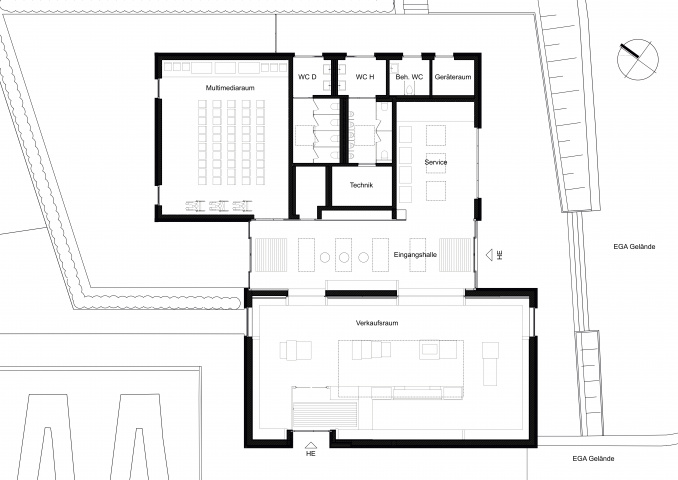 Das neue Besucherzentrum fasst die bestehende Eingangs- und Vorplatzsituation der ega auf der Süd-Ost-Seite. Das dort bisher vorhandene, ehemalige Postgebäude wird komplett zurück gebaut. Die neue Gebäudestruktur gliedert sich in drei miteinander verbundene Baukörper auf. Der zum Vorplatz gestellte Bauteil nimmt dabei exakt die Grundmaße des ehemaligen Postgebäudes auf. Damit die vorhandene Eingangsüberdachung auf dieser Seite die dringend räumlich notwendige Fassung erfährt wurde der neue Baukörper jedoch gegenüber dem Bestandsbau erhöht. Somit legt sich die filigrane Eingangsüberdachung ruhig zwischen das Verwaltungsgebäude auf der einen und den Neubau auf der anderen Seite. Der Vorplatz bekommt eine räumlich angemessene Einfassung. Das neue Gebäudeensemble gliedert sich optisch in drei Baukörper auf. Die bewusst gewählte Verschiebung der Baukörper zueinander, die unterschiedliche Fassadenmaterialien und -farben sowie die Höhenentwicklung machen diese Aufteilung deutlich ablesbar. Dominierend ist dabei der zum Vorplatz/Eingangsbereich der ega angeordnete helle Kubus. Er nimmt den neuen Shopbereich auf. Der zweite Baukörper ist wesentlich dunkler gestaltet und etwas nach hinten versetzt. Dadurch nimmt er sich bewusst optisch zurück. Als gleichzeitig trennendes und verbindendes Element funktioniert der komplett verglaste und optisch tiefer liegende Eingangs- und Erschließungsbereich zwischen diesen Baukörpern. Das sich aus dem Verbinder heraus entwickelnde Vordach umspannt horizontal den zurück gesetzten Baukörper wie eine Klammer und hält somit die Gebäudekomposition zusammen. Symbolhaft schneidet sich die hoch aufragende Infosteele durch das Vordach. Um Sie weithin als Zeichen deutlich sichtbar zu machen, überragt sie die restlichen Gebäudeteile erheblich und erhält die für die ega signifikante Farbgebung. Das neue Gebäude orientiert sich von der Höhenlage her am Vorplatz- und Eingangsbereich zur ega. Aus funktionalen und erschließungstechnischen Gründen entsteht ein Plateau um das Gebäude, das sich über eine lang gezogene begrünte Böschung wieder behutsam in den vorhandenen Geländeverlauf einbettet. Auf der Rückseite der Gebäude entsteht ein eingefasster Außenbereich, welcher multifunktional genutzt werden kann. Vom ega-Parkgelände erschließt man das Gebäude fußläufig über die vorgelagerte Treppenanlage oder den barrierefreien seitlich angeordneten Weg. Das Foyer fließt durch das Gebäude hindurch und mündet in den hinter gelagerten multifunktionalen Außenbereich. Hier kann man sich bereits mit verschiedenen Medien umfangreich informieren, in Selbstbedienung einen Kaffee trinken oder einfach nur verweilen. Seitlich sind die Funktionsbereiche angelagert. Zum Vorplatz im weißen Kubus ist der Shop untergebracht. Der abfließende Besucherverkehr wird künftig in der Regel über das Besucherzentrum und somit durch den Shop organisiert. Die zum Vorplatz/Eingangsbereich der ega orientierte Türanlage kann aber auch bei geringen Besucherzahlen, etwa in den frühen Morgenstunden oder außerhalb der Saison, als Haupteingang für die gesamte Anlage genutzt werden. Somit ist das Besetzen der normalen Kassenhäuschen unter der Eingangsüberdachung in diesen Zeiten nicht notwendig. Der Shopbereich wird von einem großen Oberlicht gleichmäßig mit natürlichem Licht versorgt. Der Raum ist umlaufend mit einem flexibel konfektionierbaren Regalsystem ausgebaut, in dem die Waren, auf den Bedarf angepasst, angeboten werden können. Ein Tresen und frei im Raum eingestreute, bewegliche, auf das Regalsystem abgestimmte boxenförmige Elemente dienen ebenfalls zur Präsentation der Ware und lassen den Raum leben. Auf der anderen Seite des Verbinders befindet sich ein Ausstellungsraum in dem Blumen und Pflanzen erworben werden können, das Personal-WC und der Multifunktionalraum. Er dient in der Regel für Kurzfilmvorführungen im normalen ega-Betrieb. Er fasst ca. 50 Personen und kann mit wenig Aufwand auch zu einem Konferenzraum oder für Feierlichkeiten umgestaltet werden. Die Filmvorführungen können vom Tresen des Shops bzw. von der Tür aus gestartet werden oder laufen automatisch ab. Der Raum wird auf die akustischen Bedürfnisse zugeschnitten ausgebaut. Den Rücken dieses Gebäudeteils bilden auf der Ostseite die WC-Anlagen, die Technik und das Lager. Die Zugänge zu den WC`s sind bewusst auf die Rückseite gelegt worden, damit der teilweise zu erwartende starke Besucherstrom entzerrt wird. Die WC-Anlagen erhalten ebenfalls Oberlichter zur natürlichen Belichtung. Der multifunktionale Freibereich hinter dem Gebäude kann für Feierlichkeiten, zur Warenpräsentation oder einfach nur als Erweiterungsfläche und Stauraum für den Besucherstrom genutzt werden. Er wird zum Zuwegungsbereich der ega durch eine abgewinkelte Sichtbetonmauer mit Sichtschlitz gefasst. Somit ist der Raum in sich geschützt aber es besteht die Möglichkeit das Geschehen außerhalb zu beobachten. Im Sichtschlitz können wie in einer Blumenbank Pflanzen nach außen wie nach innen, präsentiert werden. Zum rückwärtigen Angestelltenparkplatz dient eine Hecke als Sichtschutz und grüne Raumbegrenzung. Die bewusst kleinteilige Körpersprache im Zusammenspiel mit der Stellung der Baukörper zueinander und der ruhigen aber doch teilweise signifikanten Farbgebung erzeugen eine gestalterisch stimmige Gebäudekomposition mit hoher Funktionalität. Diese bettet sich hervorragend in das Erscheinungsbild des Eingangsbereichs der ega ein und wertet ihn durch die bewusste Fassung der Eingangsüberdachung auf der Ostseite erheblich auf. Das neue Besucherzentrum stellt nicht zuletzt im Hinblick auf die kommende BuGa 21 wertvolle neue innen- und außenräumliche Flächen und Strukturen zur Verfügung.
