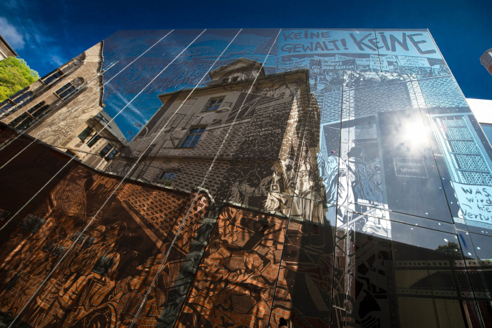 Unterdrückung und Befreiung – diese beiden Themen spiegeln sich auch in der Architektur: Authentisch erhaltene Haftzellen, moderne Ausstellungsflächen und Seminarräume bilden das Herzstück der Bildungseinrichtung. Der attraktiv gestaltete kubische Neubau mit verspiegelter Glasfassade sticht aus den gleichförmigen Klinkerstrukturen des historistischen Bestandes signalhaft heraus. Der große Veranstaltungsraum wirkt durch die großen Fassadenöffnungen hell und freundlich und steht damit in reizvollem Kontrast zur funktionalen Schäbigkeit, mit der die Insassen des Gefängnisses konfrontiert waren. Das Fassadenbild auf dem schwarz-verspiegelten Kubus zeigt Thüringer Szenen der Friedlichen Revolution im Stil einer Graphic Novel. Durch die moderne Bildsprache soll das Interesse gerade auch der jüngeren Generation geweckt werden, sich mit der jüngeren deutschen Geschichte näher auseinander zu setzen.