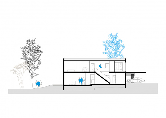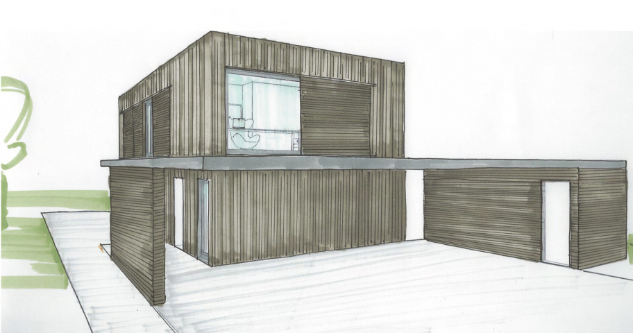 Der Neubau trägt den Namen von seiner Fassadengestaltung. Vergraute Parallelogrammleisten charakterisieren die Außenhaut des Einfamilienhauses. In seiner Dimension orientiert sich der Entwurf an dem Grundstück, lang und schmal. Vor dem Gebäude werden bis zu drei PKW-Stellplätze möglich.