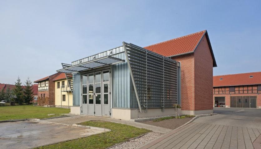 Unter Denkmalschutz (Ensembleschutz) stehende 4-seitige Hofanlage wird als landwirtschaftliches Betriebsgebäude genutzt. Das 1848 errichtete straßenseitige Haupthaus dient als Bürogebäude, die angrenzenden Seitenflügel und die ehemalige Scheune beherbergen Garagen, Sozial- und Arbeitsräume, Heizraum, Mehrzweckraum, Werkstatt und Lagerräume.