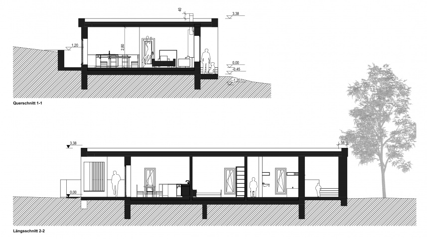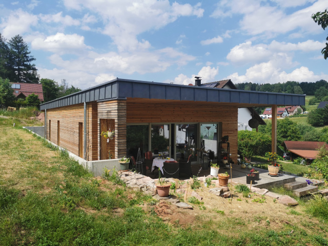Eine Herausforderung und Chance zugleich stelle für den Bungalow die starke Hanglage dar. Mit dem teils in den Hang eingestelltem Baukörper passt sich der Neubau gut in die Topographie ein. Talseitig gewährt er großartige Ausblicke auf den tieferliegenden Ortskern.