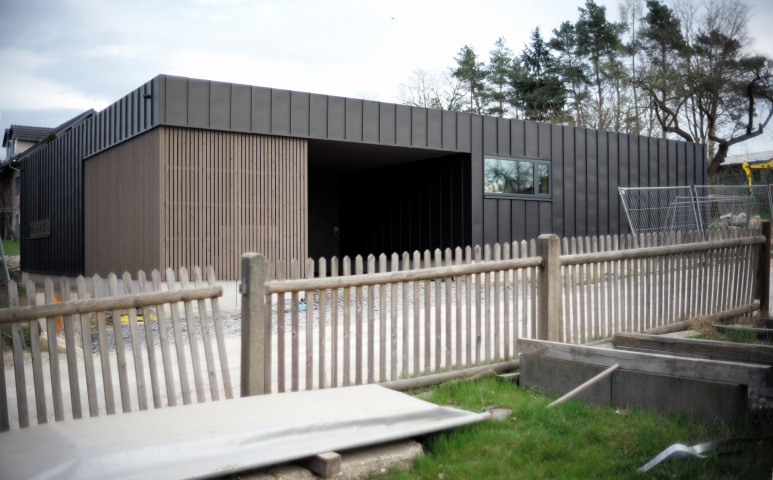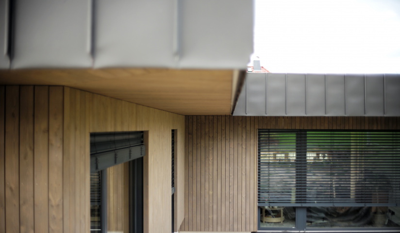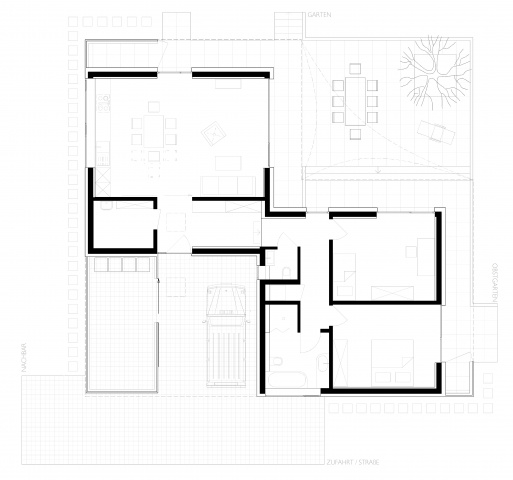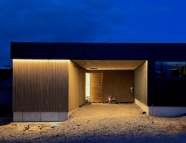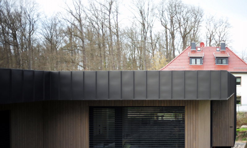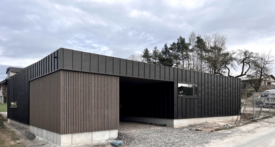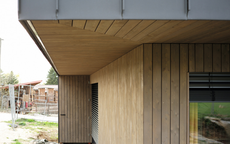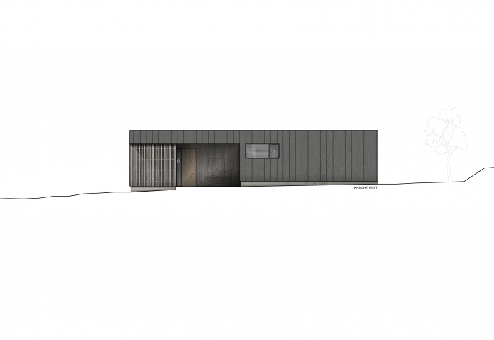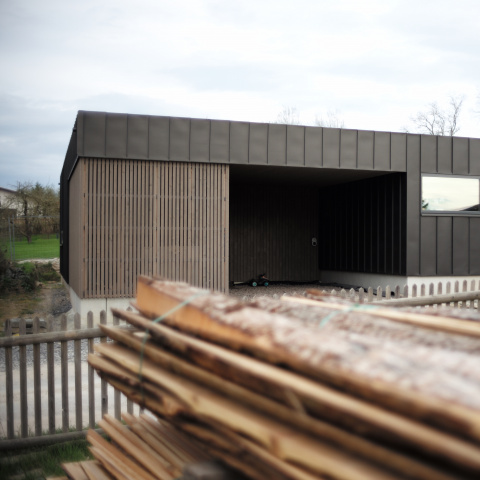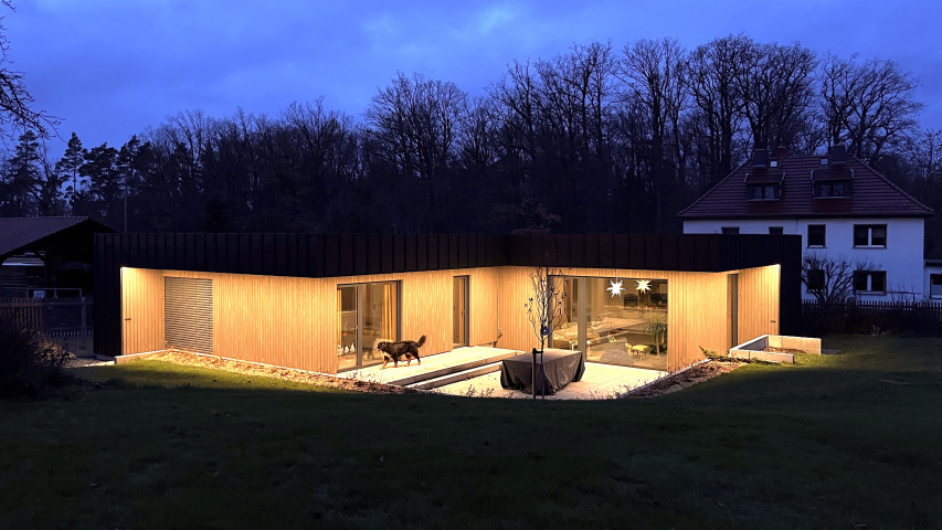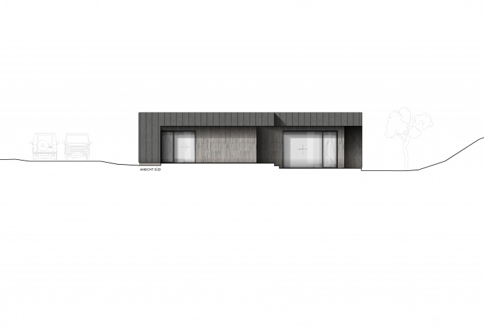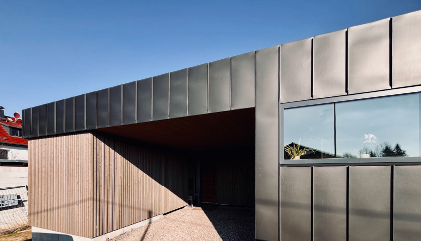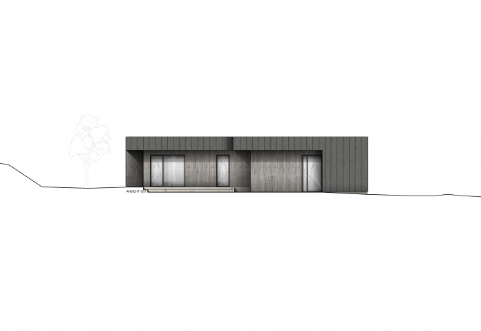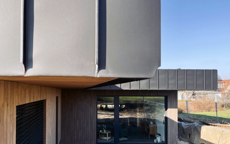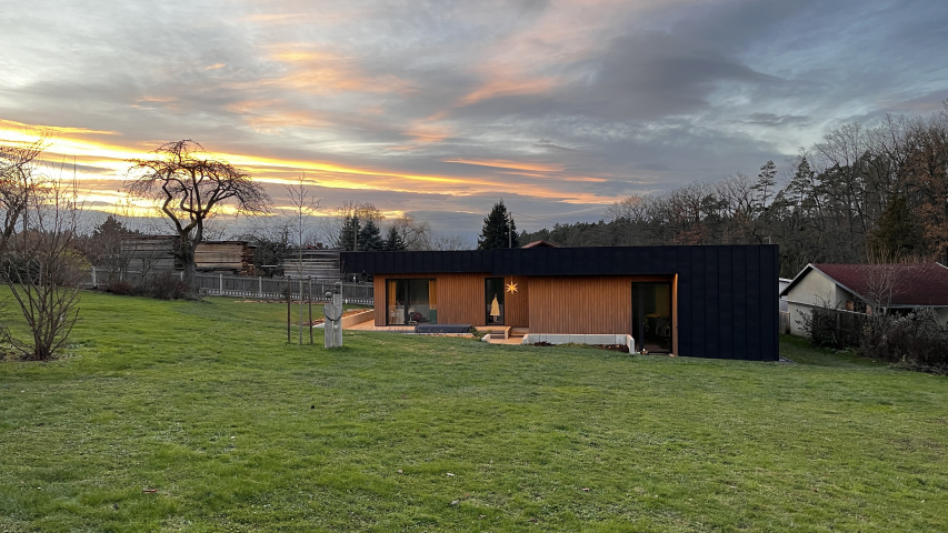 Im ländlichen Raum bildet dieser Neubau einen bewussten Kontrast zur konventionellen Ortsbebauung als eine zeitgenössisch klare Architektur. Der Baukörper gliedert sich als Holzrahmenbau in eine Wohn- und eine Schlafebene welche sich als zwei ineinander geschobene Quadrate zueinander höhenversetzt über einen schmalen Durchgang verbinden. Die wetterzugewandten Fassaden wurden mit einer anthraziten vorbewitterten Stehfalzfassade geplant wogegen die überdachten Gartenaustrittsbereiche mit vorbewitterter Holzfassade sich wohnlicher zeigen. Den Bauherren war wichtig ein Gebäude im Bungalowstil zu erhalten was auch im höherem Alter gut bewohnbar ist. Durch Photovoltaik mit Speicher und einer Luftwärmepumpe mit Kühlfunktion soll das Gebäude möglichst autark auch im Sommer gut gekühlt durch die lehmgeputzte Heiz-Kühldecke ganzjährig Wohlfühlatmosphäre bieten.