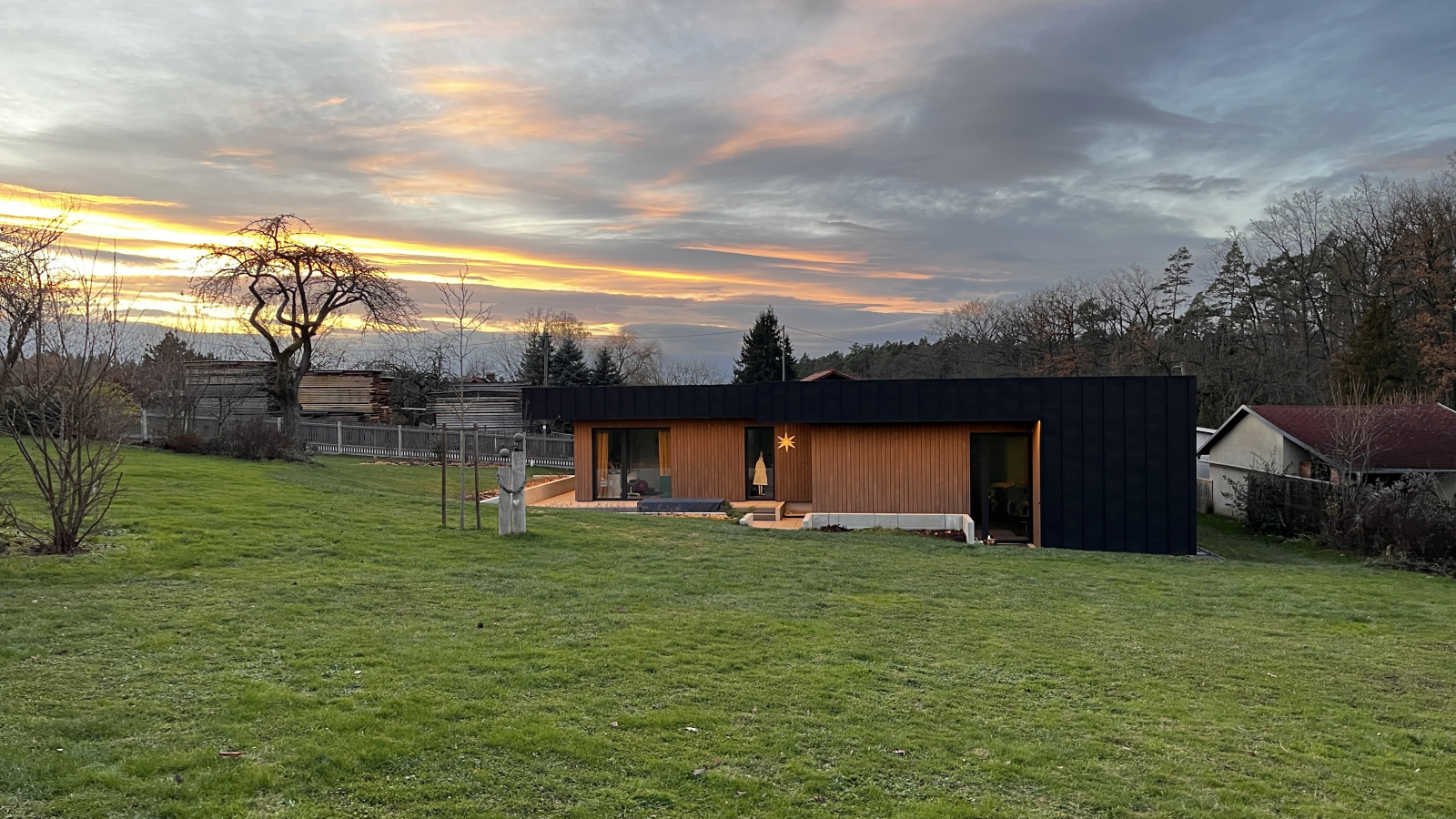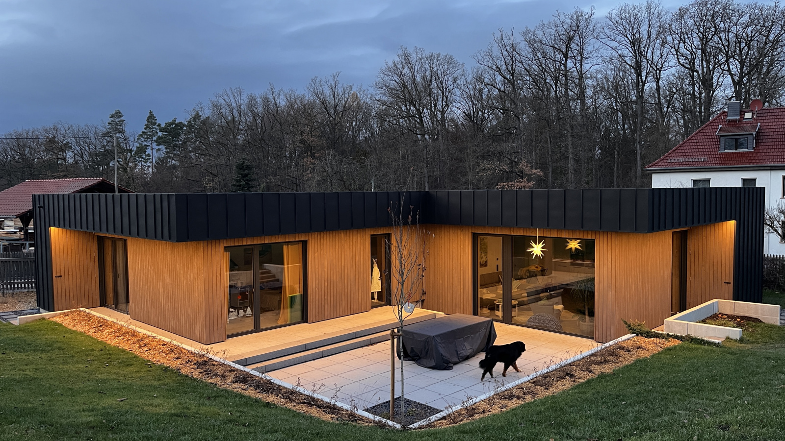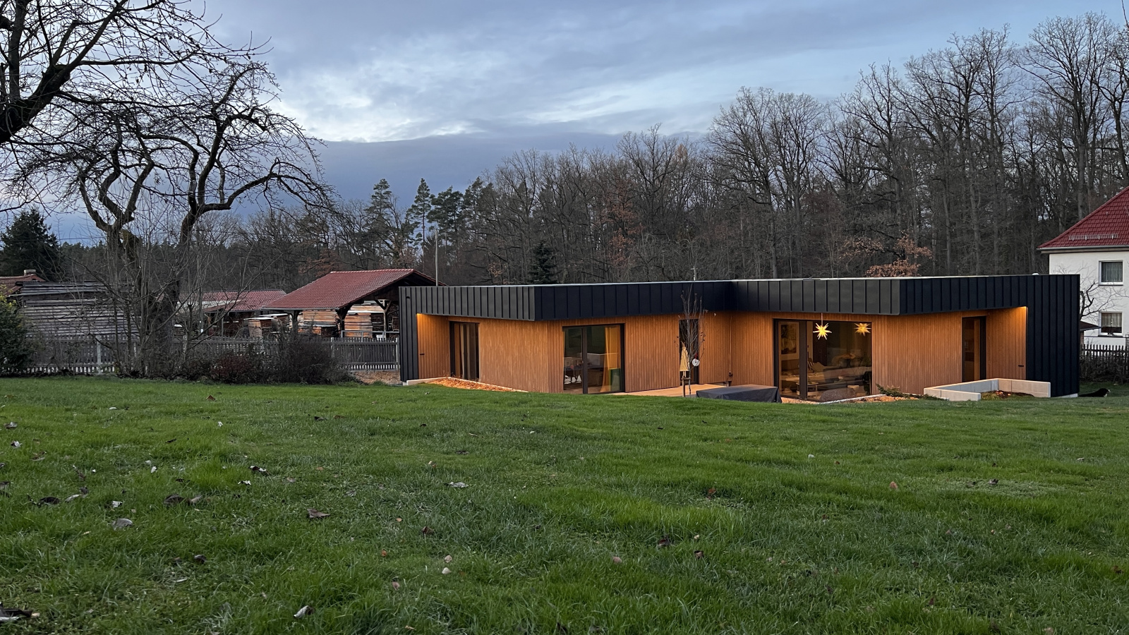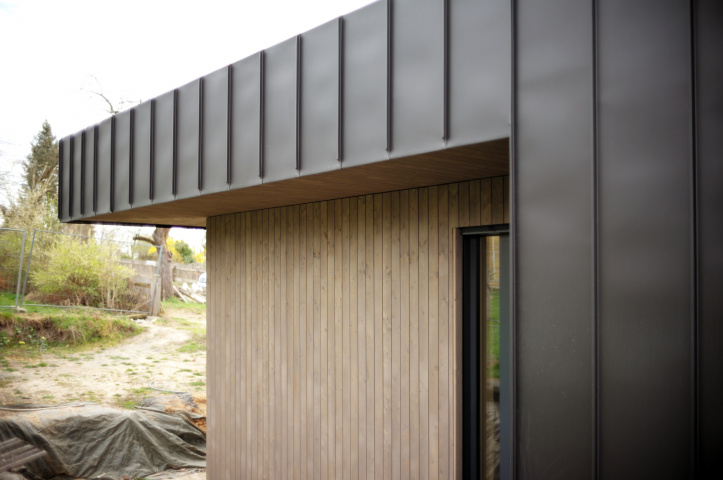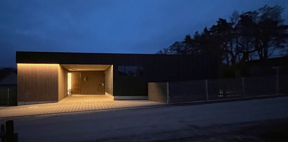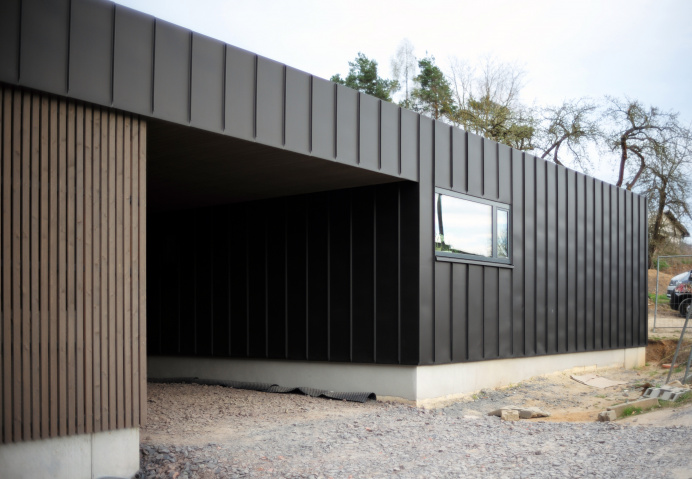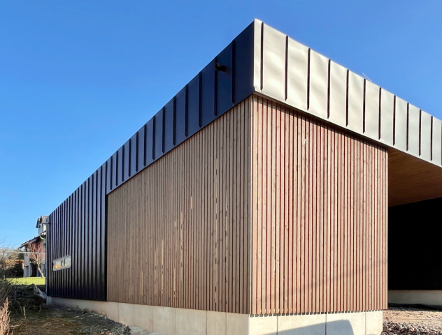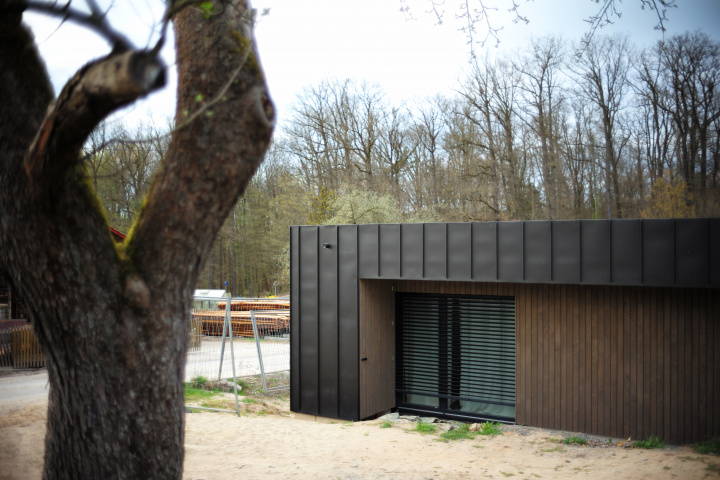 Im ländlichen Raum bildet dieser Neubau einen bewussten Kontrast zur konventionellen Ortsbebauung als eine zeitgenössisch klare Architektur. Der Baukörper gliedert sich als Holzrahmenbau in eine Wohn- und eine Schlafebene welche sich als zwei ineinander geschobene Quadrate zueinander höhenversetzt über einen schmalen Durchgang verbinden. Die wetterzugewandten Fassaden wurden mit einer anthraziten vorbewitterten Stehfalzfassade geplant wogegen die überdachten Gartenaustrittsbereiche mit vorbewitterter Holzfassade sich wohnlicher zeigen. Den Bauherren war wichtig ein Gebäude im Bungalowstil zu erhalten was auch im höherem Alter gut bewohnbar ist. Durch Photovoltaik mit Speicher und einer Luftwärmepumpe mit Kühlfunktion soll das Gebäude möglichst autark auch im Sommer gut gekühlt durch die lehmgeputzte Heiz-Kühldecke ganzjährig Wohlfühlatmosphäre bieten.