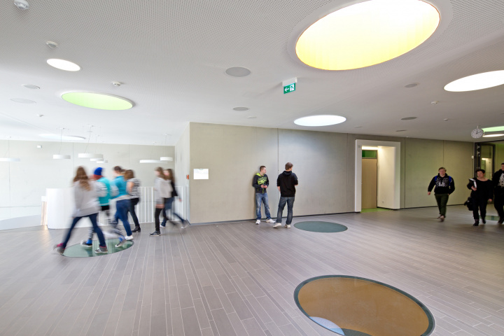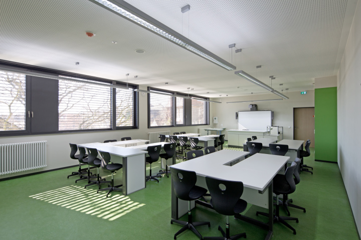 Klassentrakten. Neben Klassenräumen und Fachkabinetten für traditionellen Frontalunterricht wurden Räume für alternative, offenere Lernformen geplant. Gruppenarbeitsräume und Werkstätten mit flexibler Möblierung, Sitz- und Lernnischen in den Erschließungszonen sind Beispiele dafür.