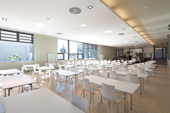Mehrzwecksaal und ein Internetcafe zugeordnet sind. Multifunktionalität war ein wichtiges Entwurfskriterium. Der Mehrzwecksaal ist Mensa und Aula in einem. Vielfältige Nutzungsmöglichkeiten birgt auch das Raumangebot in den