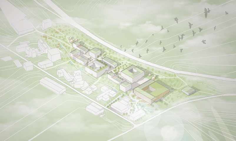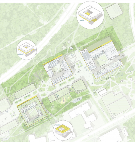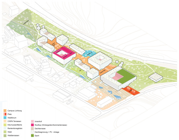 Der neue Campus wird als Lichtung im stark bewaldeten Areal angelegt und erhält vielfältige Freiräume in Waldatmosphäre, die sich als regenerative und kreativitätsfördernde Aufenthaltsorte präsentieren.