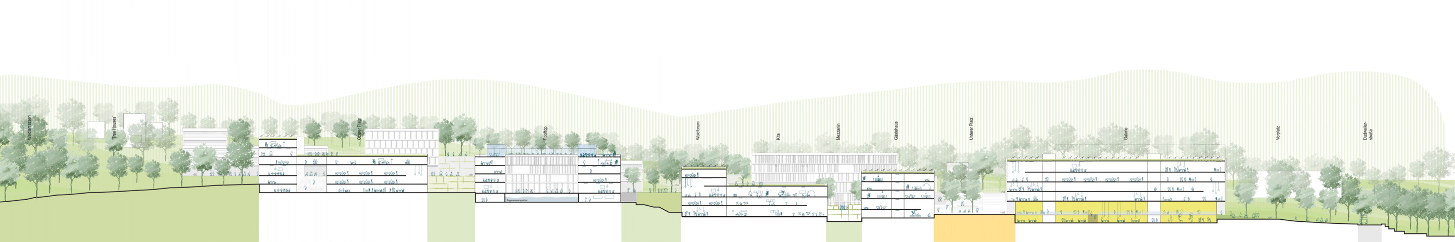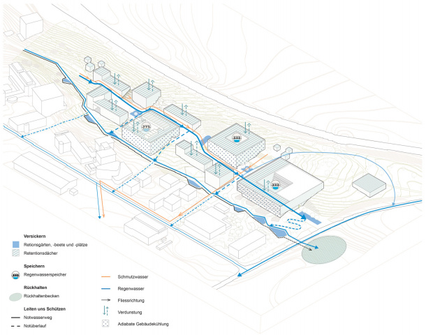 Wassermanagement muss aufgrund der lokalen Bedingungen eine Leitidee für die Konfiguration des Gebietes sein. Unter entsprechender Berücksichtigung werden durch die Gebäudesetzungen diverse, vielfältige und qualitativ hochwertige Freiflächen etabliert.