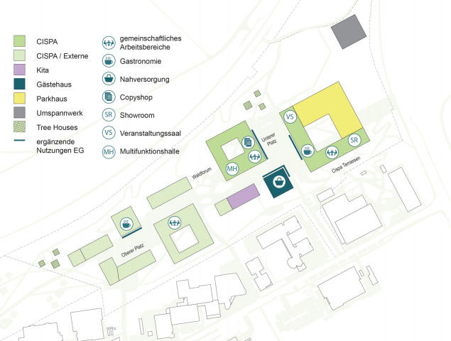 Ziel der Entwicklungsstrategie ist, den CISPA-Campus als neuen Orientierungspunkt im Universitätsstandort mit einem Schwerpunkt im östlichen Teil des Areals zu etablieren. Die grossflächigen Grundrisse der drei Hauptgebäude erlauben flexible interne Nutzungen.