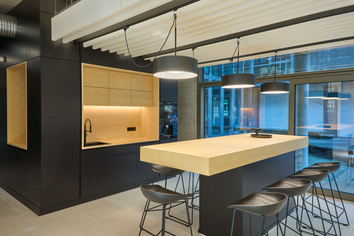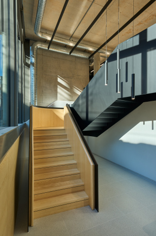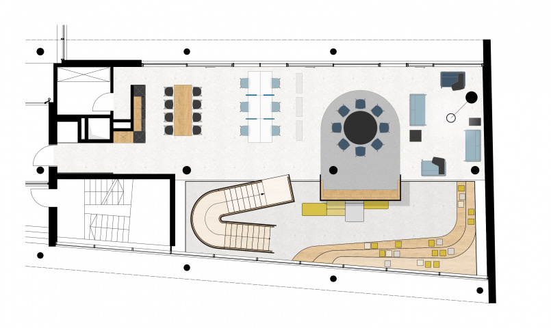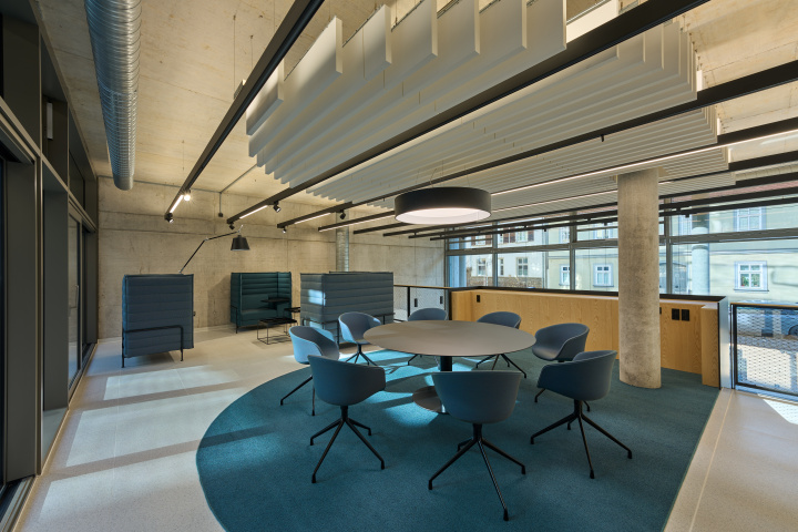 Gewachsene traditionelle Bürostrukturen treffen auf neue flexible Arbeitswelten. Lebendiger, roher Beton und schlichte Flächen treffen auf farbliche Akzente, Holz und schwarzen Stahl. Bestehende Raumvolumen treffen auf skulpturale Aus- und Einbauten. Lichtdurchflutende Glasfassaden treffen auf ausgewählte Beleuchtungskonzepte. Das mehr als 20 Jahre alte Verwaltungsgebäude wird durch diese Maßnahmen in Teilbereichen im Erdgeschoss auch baulich den heutigen Anforderungen angepasst. Die vorgefundene Raumsituation wurde durch Eingriffe im Rohbau und Ausbau weiter ausformuliert und mit einem eigenständigen Farb- und Materialkonzept in ein, in seiner Form einzigartiges, DenkDeck mit Forum überführt – ein Co-Working Space, das zum kreativen Arbeiten einlädt.