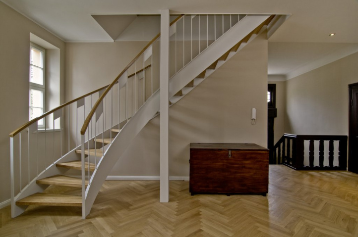 Eine leicht geschwungene Stahltreppe führt von der freigestellten Diele im Obergeschoss zum neu ausgebauten Dachgeschoss.