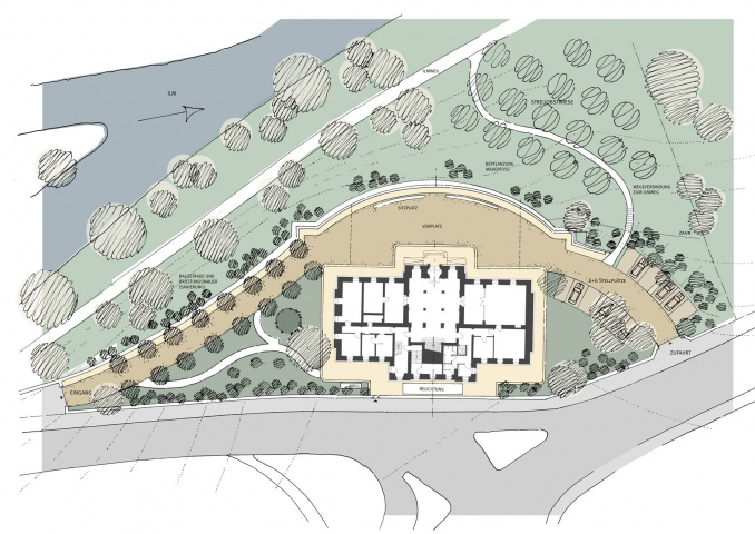Zur denkmalgerechten Erweiterung des historisch bedeutsamen Archivgebäudes wurde eine Ergänzung der Hauptnutzfläche unterhalb der Eingangsterrasse zur Ilm gebaut.