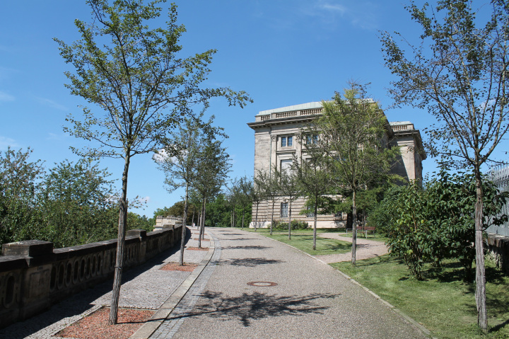 Der Neubau der Platzfläche erfolgte in optischer Anlehnung an den ehemaligen Kiesbelag als heller Asphaltbelag mit speziell aufbereiteter Kieseinstreu. Auch die gesamte Zaunanlage incl. ihrer Sockelmauern wurde saniert. An der reaktivierten, nördlichen Zufahrt befinden sich die neuen Pkw Stellplätze. Damit bleibt die südliche Auffahrt in Zukunft den Fußgängern vorbehalten.