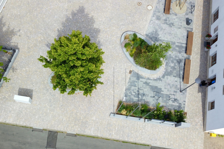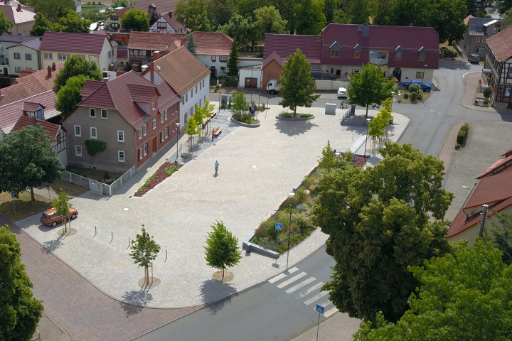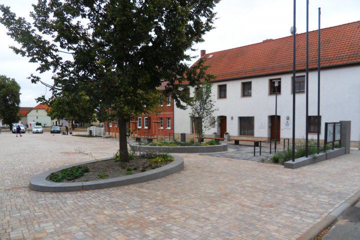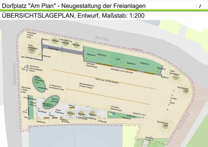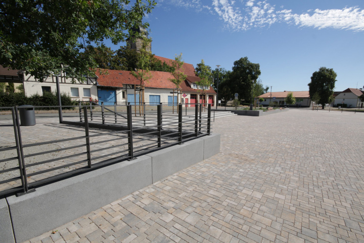 Der Dorfplatz wurde unter Einbeziehung des vorhandenen Baumbestandes als Platz für Veranstaltungen, Märkte und als Ortsmittelpunkt mit hoher Aufenthaltsqualität umgestaltet. Die umlaufenden Elemente aus Sitzmauer, Stufen und Mauerscheiben rahmen den Platz. Das Plattenband vor den südlichen Fassaden wird als Hauptverweilbereich ausgebildet und von der Veranstaltungsfläche optisch abgesetzt. Zentraler Punkt des Platzes ist der Sitzbereich mit seinen elliptischen Hochbeeten und Sitzmauern mit besonders hochwertiger Bepflanzung. Von einem Balkon an der Bestandseiche ist der Platz gut zu überblicken. Die Platzwestseite erhält als Raumabschluss Mauerscheiben, an denen die Hinweis- und Informationsträger der Gemeinde integriert wurden.