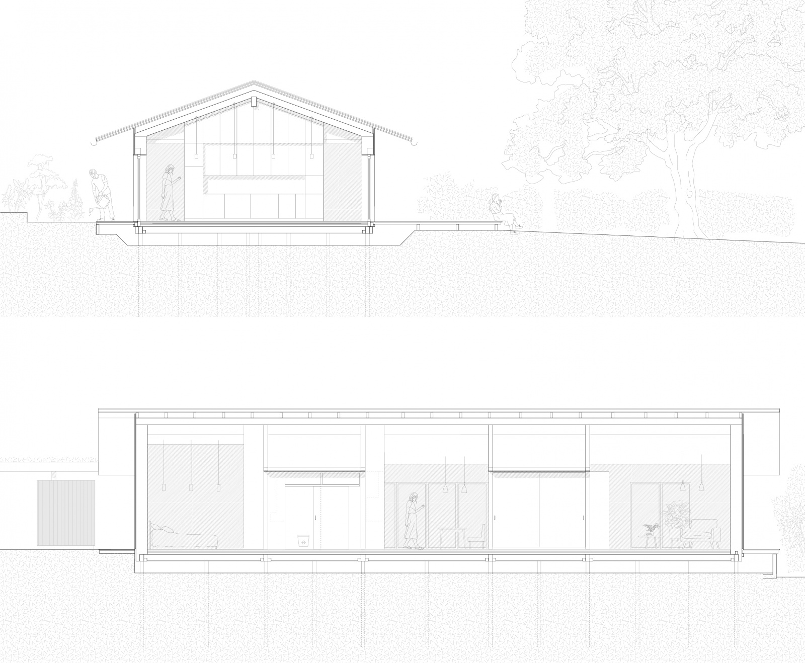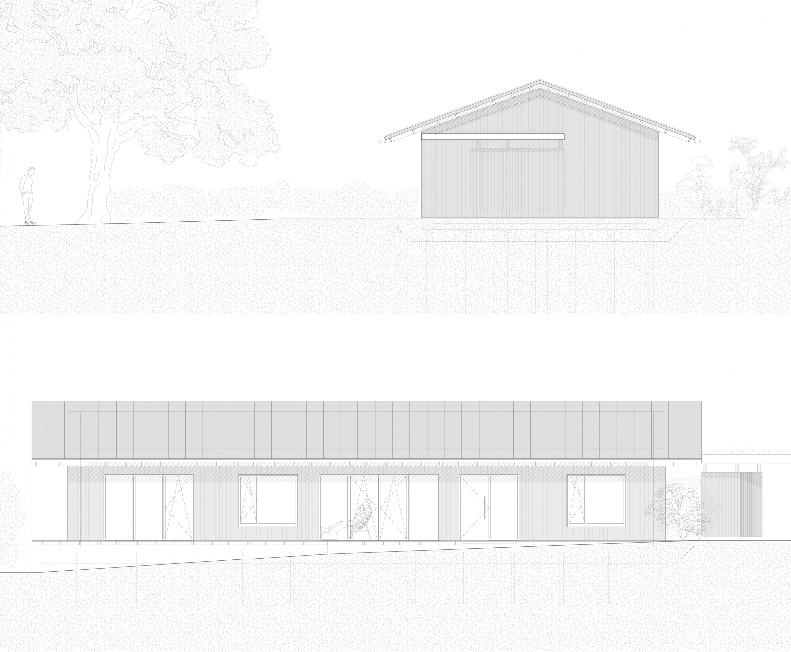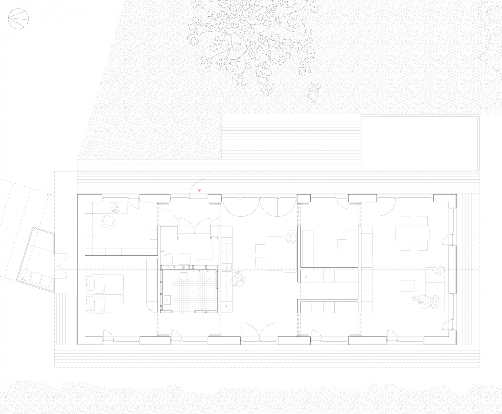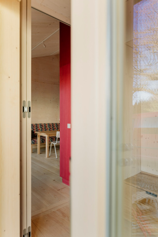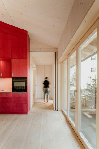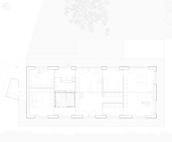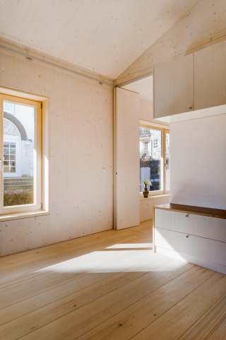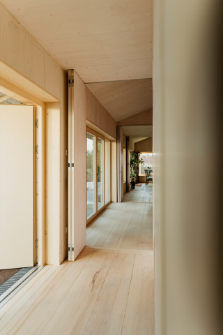 Eingebettet in zweiter Reihe zur Erfurter Straße - dem Ort ihrer Kindheit - entstand ein barrierefreies Massivholzhaus als Alterssitz für Schwester und Schwager der Bauherrin. Der schlichte Grundriss erfüllt alle Wünsche und bleibt flexibel für spätere Nutzer. Die Tragstruktur gliedert die Räume. Sicht-und Wegachsen entlang der Fassade schaffen ein freies durch Falttüren zonierbares Raumgefüge. Monolithisches, leimfreies Mondholz (Holz100) und kreislauffähige Rohstoffe verfolgen einen klaren ökologischen Ansatz. Gegründet auf Schraubfundamenten wird die Bodenversiegelung reduziert. Auskragend schützt das Satteldach die Konstruktion sowie die umlaufende Terrasse und spendet Schatten. Die Blühwiese mit altem Gravensteiner und Wasserbecken gestalten den Garten als biodiversen Rückzugsort.