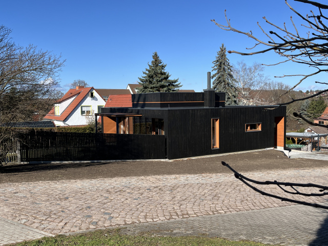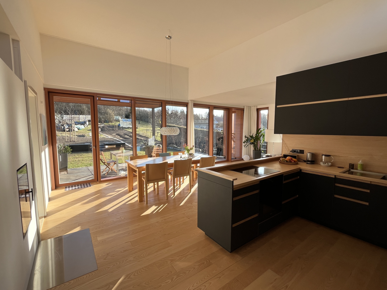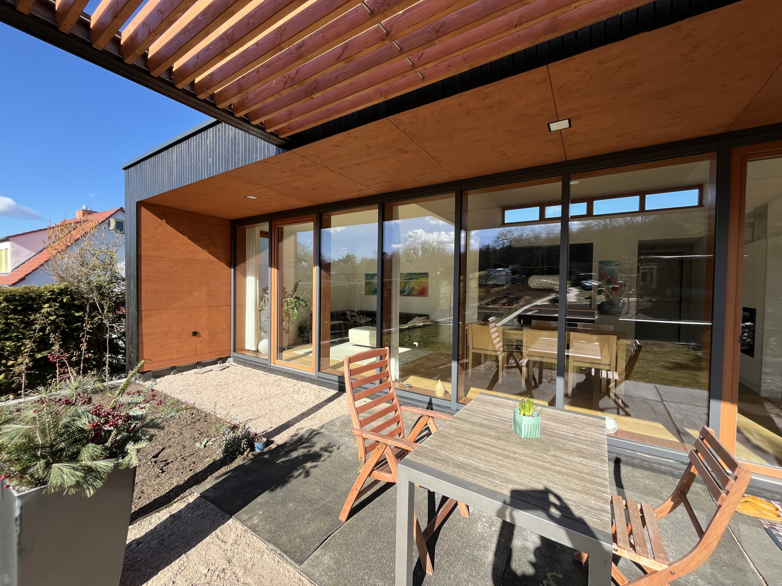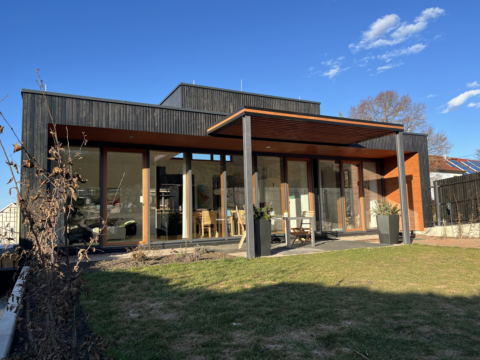 Aus der Idee, sich nach dem Auszug der Kinder zu verkleinern, entstand ein eingeschossiges, ökologisches Haus aus Holz und Lehm, das sich nach Süden zum Garten hin öffnet. Die großzügige Glasfront wurde als tragende Holz-Pfosten-Riegelfassade errichtet, wobei die Überdachung als baulicher Sonnenschutz dient. Die Überhöhung im zentralen Bereich bringt zusätzliches Licht in den Kochbereich. Durch die offene Gestaltung des zentralen Koch- Ess- und Wohnbereiches entsteht ein großzügiger Raumeindruck. Das Haus wurde als tragendes Holzfachwerk errichtet, mit Stampflehm ausgefacht, die Innenwände mit Lehm verputzt und die Außenwände mit Holzfaserdämmplatten sowie lasierten Lärchenleisten verkleidet. Die Massivholzdecken sind mit Schilfmatten bekleidet und ebenfalls mit Lehm verputzt worden.