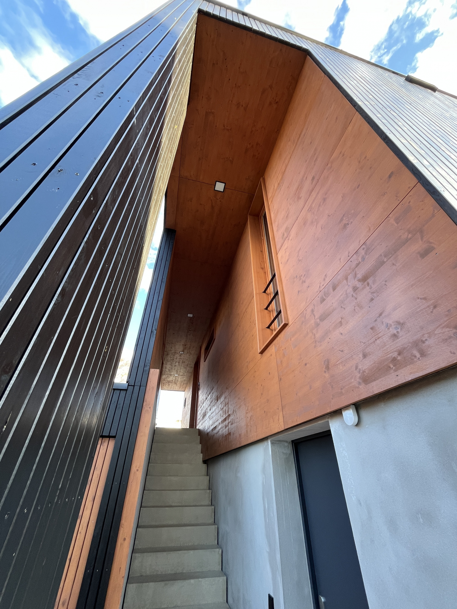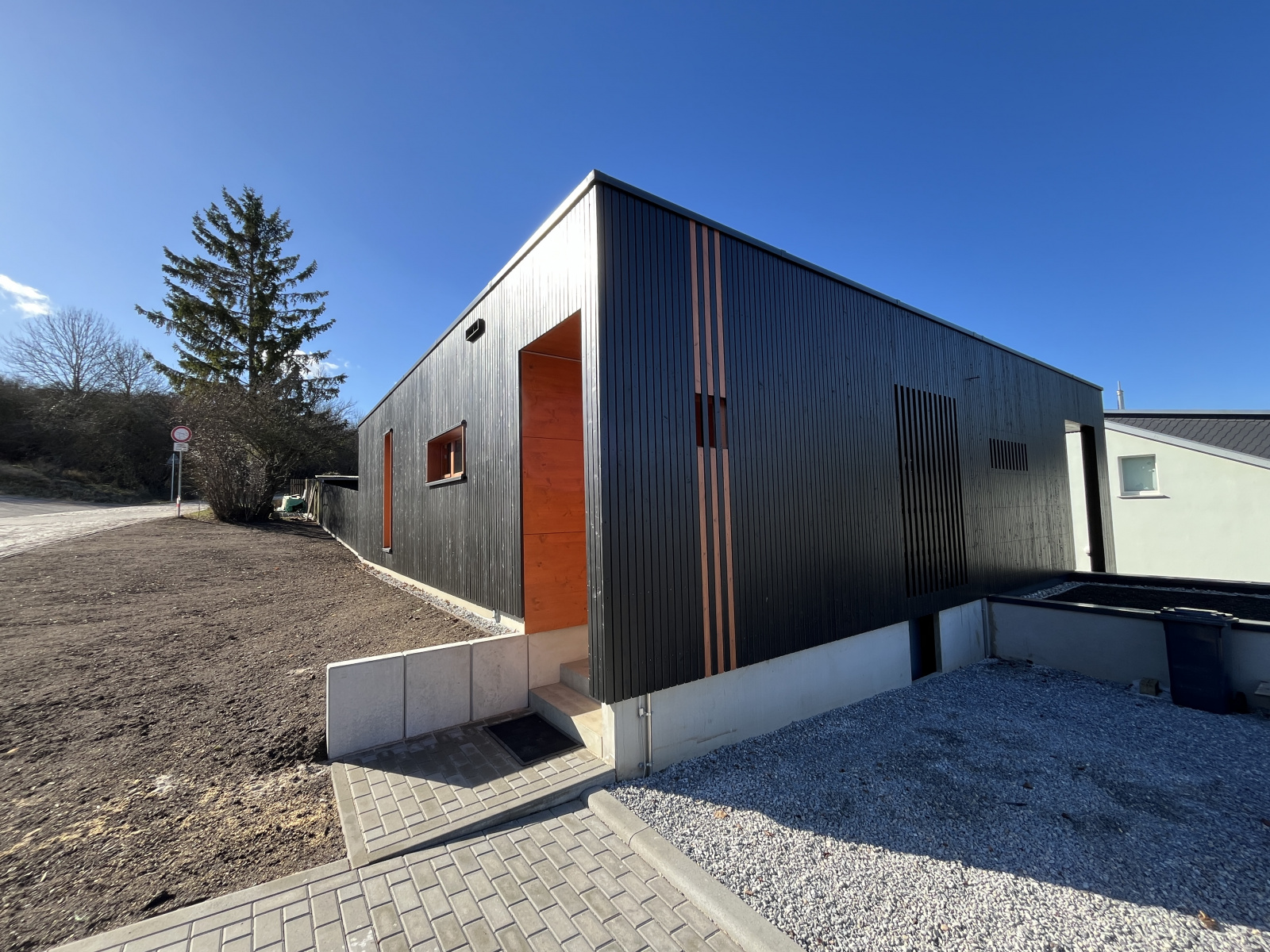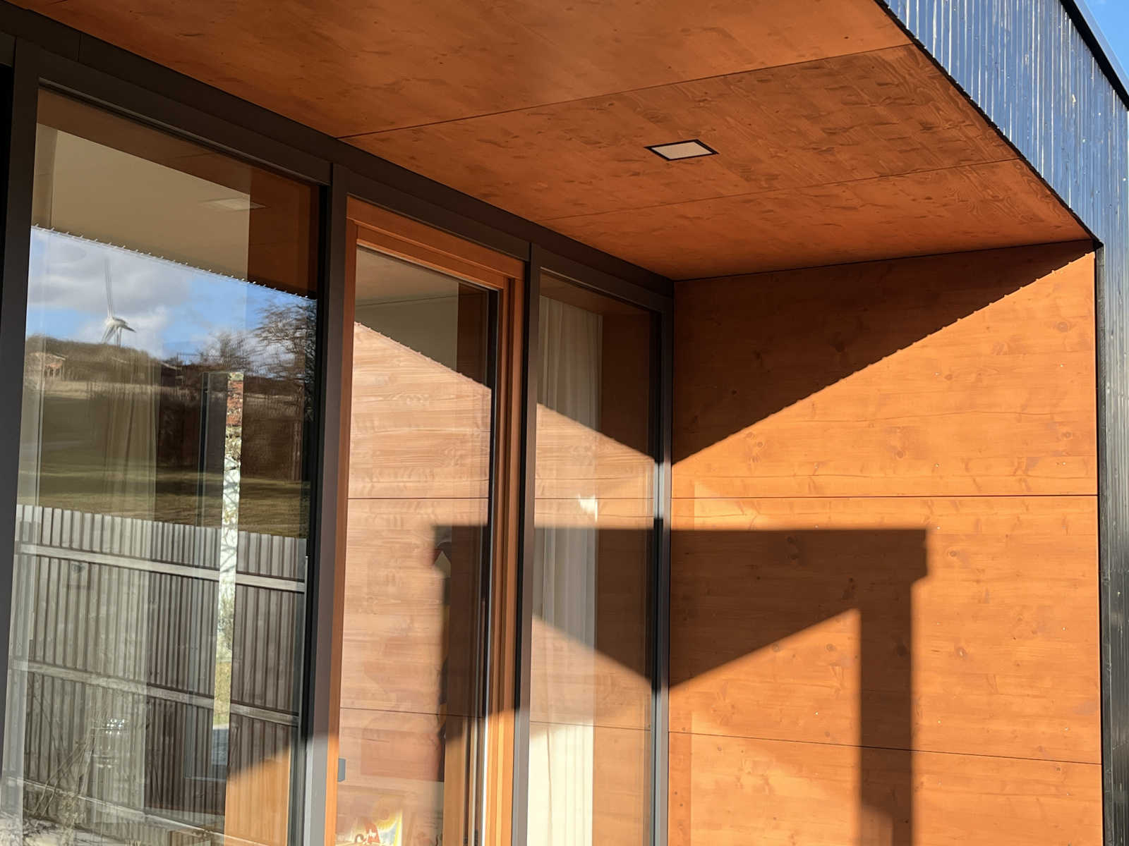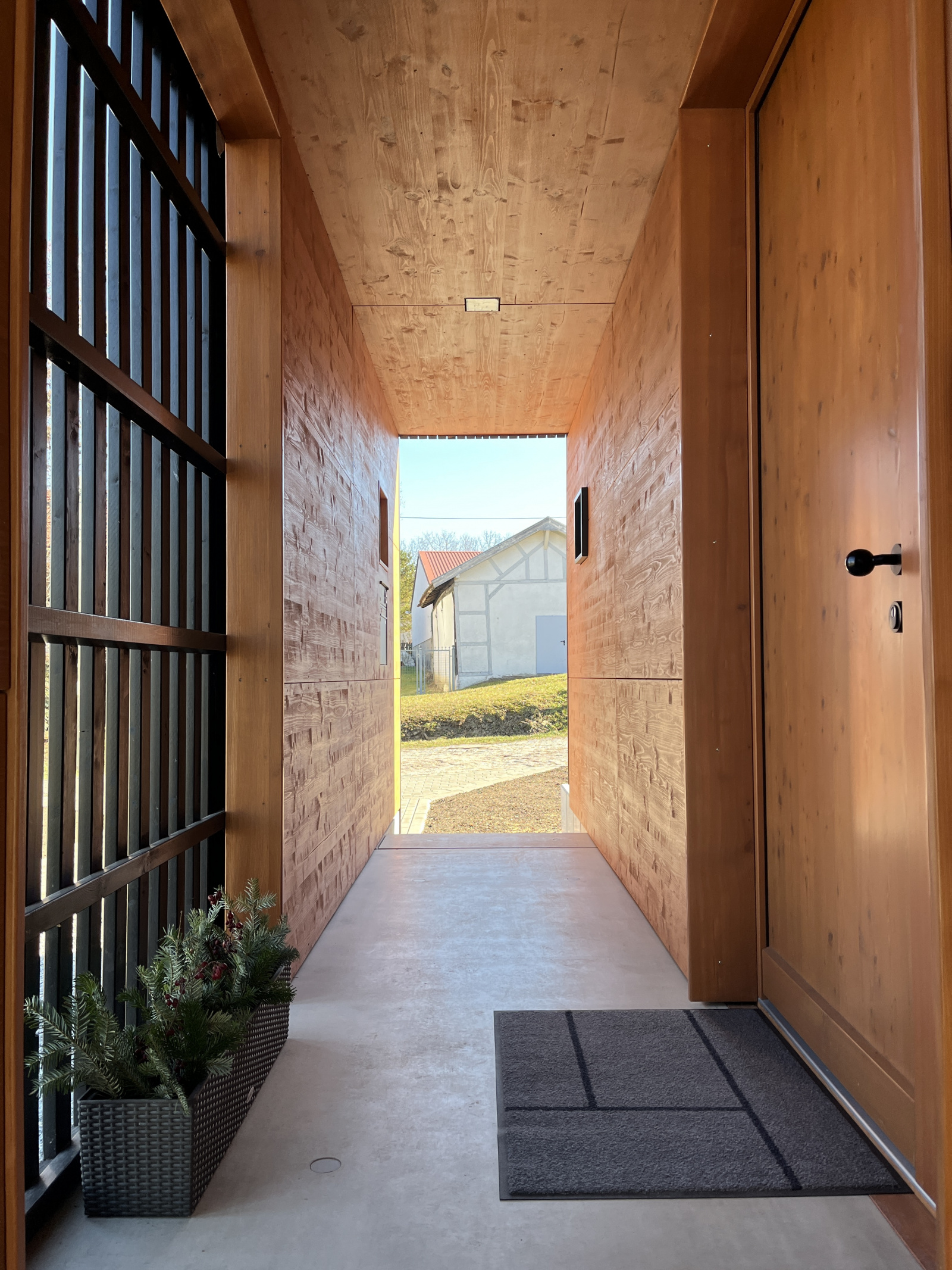 Aus der Idee, sich nach dem Auszug der Kinder zu verkleinern, entstand ein eingeschossiges, ökologisches Haus aus Holz und Lehm, das sich nach Süden zum Garten hin öffnet. Die großzügige Glasfront wurde als tragende Holz-Pfosten-Riegelfassade errichtet, wobei die Überdachung als baulicher Sonnenschutz dient. Die Überhöhung im zentralen Bereich bringt zusätzliches Licht in den Kochbereich. Durch die offene Gestaltung des zentralen Koch- Ess- und Wohnbereiches entsteht ein großzügiger Raumeindruck. Das Haus wurde als tragendes Holzfachwerk errichtet, mit Stampflehm ausgefacht, die Innenwände mit Lehm verputzt und die Außenwände mit Holzfaserdämmplatten sowie lasierten Lärchenleisten verkleidet. Die Massivholzdecken sind mit Schilfmatten bekleidet und ebenfalls mit Lehm verputzt worden.