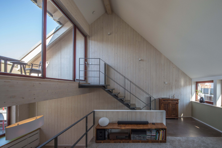 Durch eine Splitt-Level-Lösung wird die bebaubare Fläche von nur 58m² optimal ausgenutzt. Die raumhohen Schiebetüren ermöglichen das Gefühl des „Durchwohnens“ von der West- zur Ostseite. Im Dachgeschoss öffnet sich der Grundriss zu einer großzügigen Wohnlandschaft mit Terrasse und Domblick.