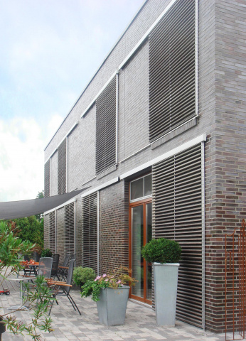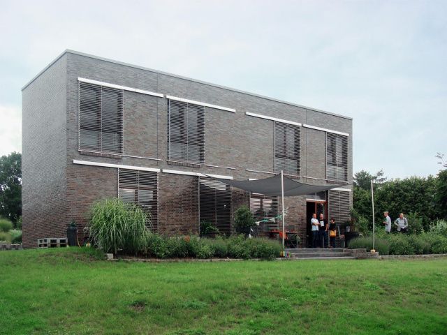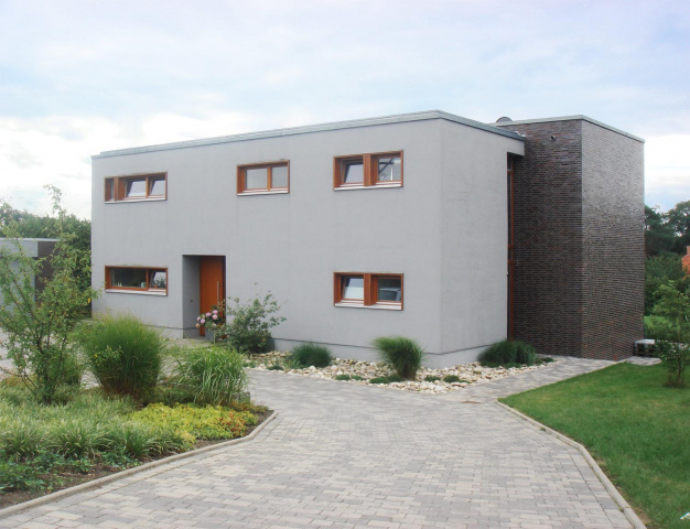 Auch von außen kann man die Teilung durch die Wahl unterschiedlicher Fassadenmaterialien, Putz bzw. Klinker, erkennen.