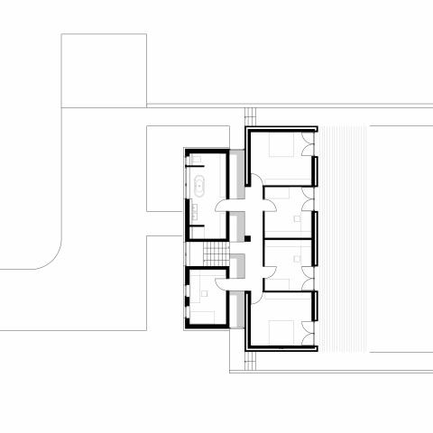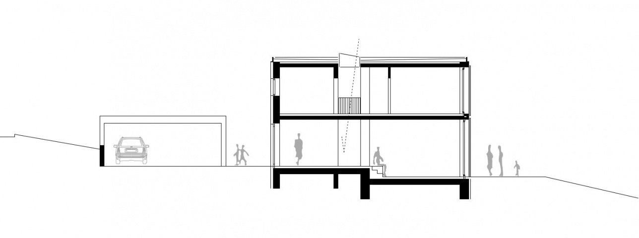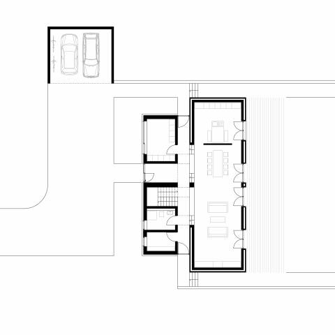 Neubau eines Einfamilienhauses in Gehlenberg. Das Gebäude ist durch eine Fuge zweigeteilt. Im kleineren Teil befinden sich die sogenannten dienenden Räume wie Bad, Diele, Gäste-WC und Hauswirtschaftraum. Im größeren Teil befindet sich im EG das große Wohnzimmer mit Küche und im OG die Kinderzimmer und das elterliche Schlafzimmer.