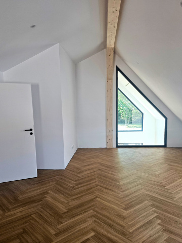 Das Einfamilienhaus wurde mit einer bequem zu erreichenden Raumharmonie geplant, wodurch alle Wohnräume auf der Erdgeschossebene liegen. Im Dachgeschoss befinden sich nur das Arbeitszimmer und die Hochbettebenen der Kinderzimmer. Der First des Daches ist asymmetrisch angeordnet, was dem Gebäude eine markante Form verleiht. Die Fassade ist mit vertikalen Holzlatten verkleidet, die für eine natürliche und warme Ausstrahlung sorgen. Die Küche ist bis in den Dachstuhl geöffnet, wodurch ein großzügiger Luftraum entsteht. Vom Arbeitszimmer aus blickt man durch ein innenliegendes Fenster sowohl in die Küche als auch in den Garten durch ein weiteres Fenster in der Außenwand das in derselben Sichtachse positioniert wurde. Gleichzeitig dringt so zusätzliches Tageslicht in die Dachgeschossebene.