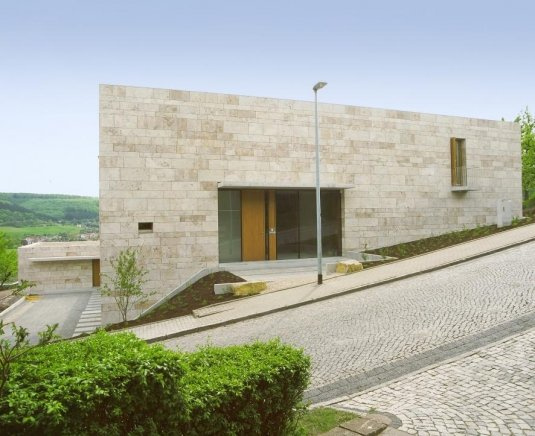 Der exponierte Standort steht diesem Haus ausnehmend gut. Sorgfältig platziert an einem Straßenknick des Stadtweges oberhalb von Sondershausen, markiert der kantige Baukörper beiläufig den Übergang in die alte Ortslage Jechaburg. Selbstbewußt dramatisiert die kräftige, als “Stein in der Landschaft” gedachte Form die hügelige Umgebung und sucht wiederum einen Ausgleich durch die Textur und Farbe der gänzlich mit Kalkstein verkleideten Außenwände. Ohne seine Prägnanz aufzugeben, staffelt sich der Bau optisch in drei Teilkörper, deren mittlerer, als zentraler Wohnraum völlig verglast, die Natursteinflächen der übrigen wirkungsvoll kontrastiert.