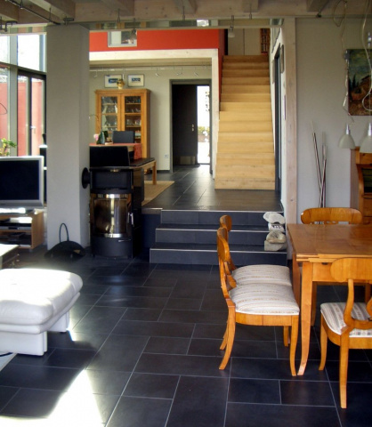 Das zweigeschossige Einfamilienhaus befindet sich am westlichen Rand von Niedergrunstedt und wurde für die Bauherren als fließende Raumfolge konzipiert. Der zentral angeordnete, zweigeschossige Essplatz verbindet den Wohnraum und die Küche im Erdgeschoss mit dem Arbeitsbereich im Obergeschoss. Lediglich Bad, Schlaf- und Gästezimmer sind davon abgetrennt.