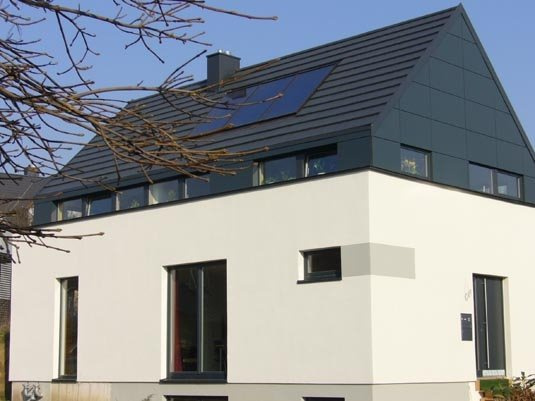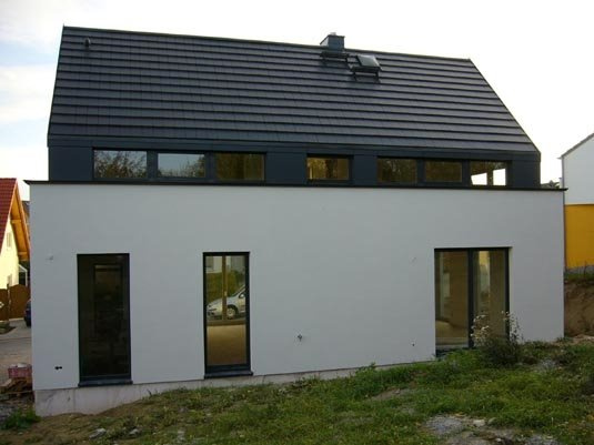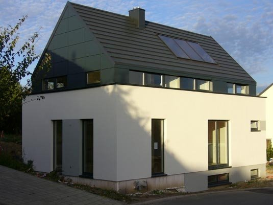 Das Grundstück liegt im Bebauungsplangebiet Erfurt-Marbach. Ziel war die Planung eines Einfamilienhauses für eine dreiköpfige Familie mit ca. 120m² Wohnfläche in zeitgemäßer Architektursprache unter Vorgabe eines engen Kostenbudgets. Entstanden ist ein gegliederter Baukörper, der sich zur Südseite öffnet und so eine maximale Belichtung der dahinter liegenden Wohnräume ermöglicht sowie solare Gewinne ausnutzt. Ein zentraler Essbereich im Erdgeschoss bildet den Mittelpunkt des Hauses und fungiert als Verteiler in Küche, Wohnbereich und Obergeschoss. Die umlaufenden Fenster im Dachgeschoss belichten die oberen Räume optimal und ermöglichen einen „Rundumblick“ in das Erfurter Umland. Der massive Erdgeschosskubus erhielt eine Wärmedämmfassade. Das in Holztafelbauweise errichtete zurück springende Dachgeschoss wurde mit Trespaplatten verkleidet. Der Rücksprung wird im Innenbereich als Einbauschrank genutzt.
